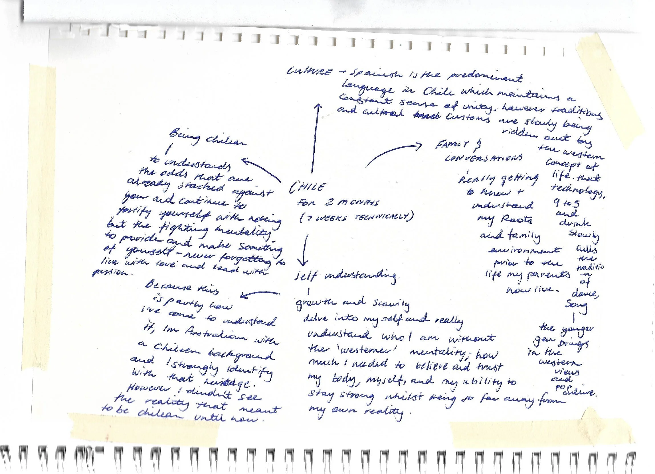 Physical notes are a strong part of my conceptual process, especially for brainstorming and working through my thoughts for a project of any size. The brainstorm above, outlines the connection to my chilean heritage and why I connect to it so strongly through Art. Therefore reminding myself of the purpose and drive behind all of my projects.