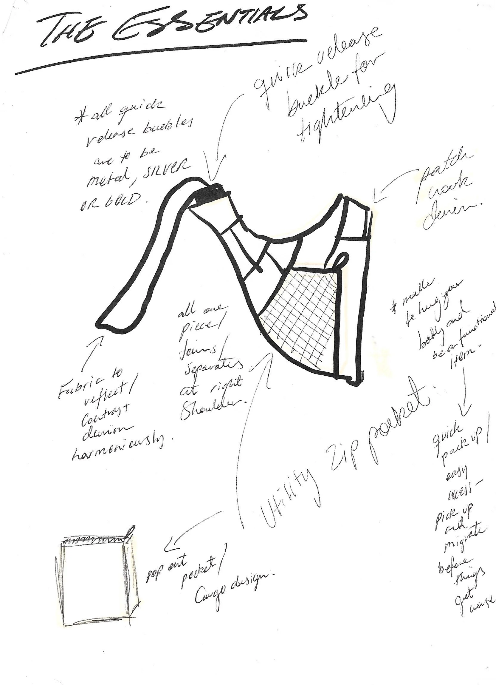 Within this product sketch, I outline the elements and purpose of the vest. “Smaller to hug your body and be a functional item” The vest was made with the intention of being useful from the very beginning of it’s design.