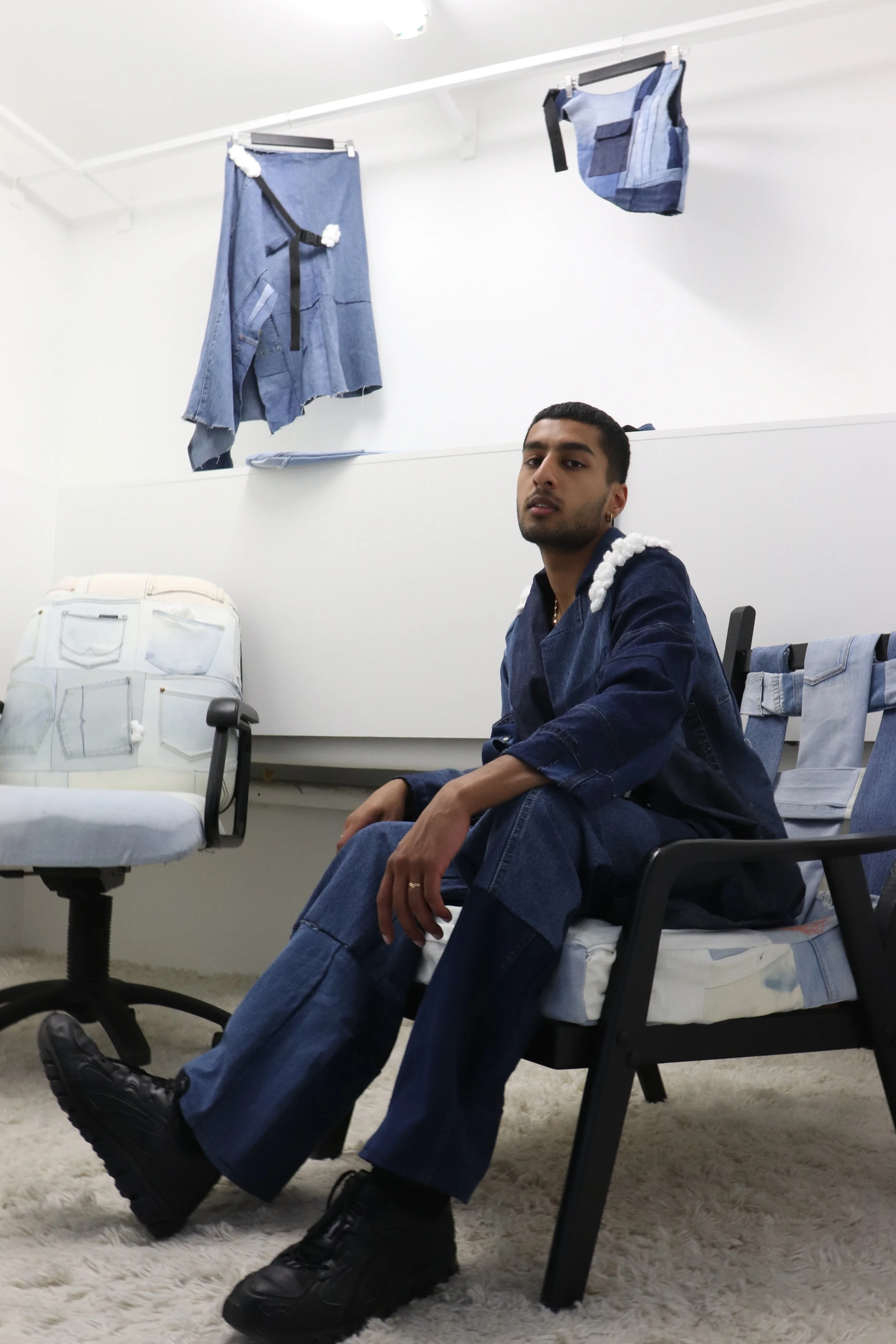 July Stewart wears the patchwork utility vest within the exhibition space. He is sitting on a customised denim seat, whilst he caresses the vest. Stewart was chosen specifically, as he has the ability to connect to the notions of Immigrant culture and what denim means to him.