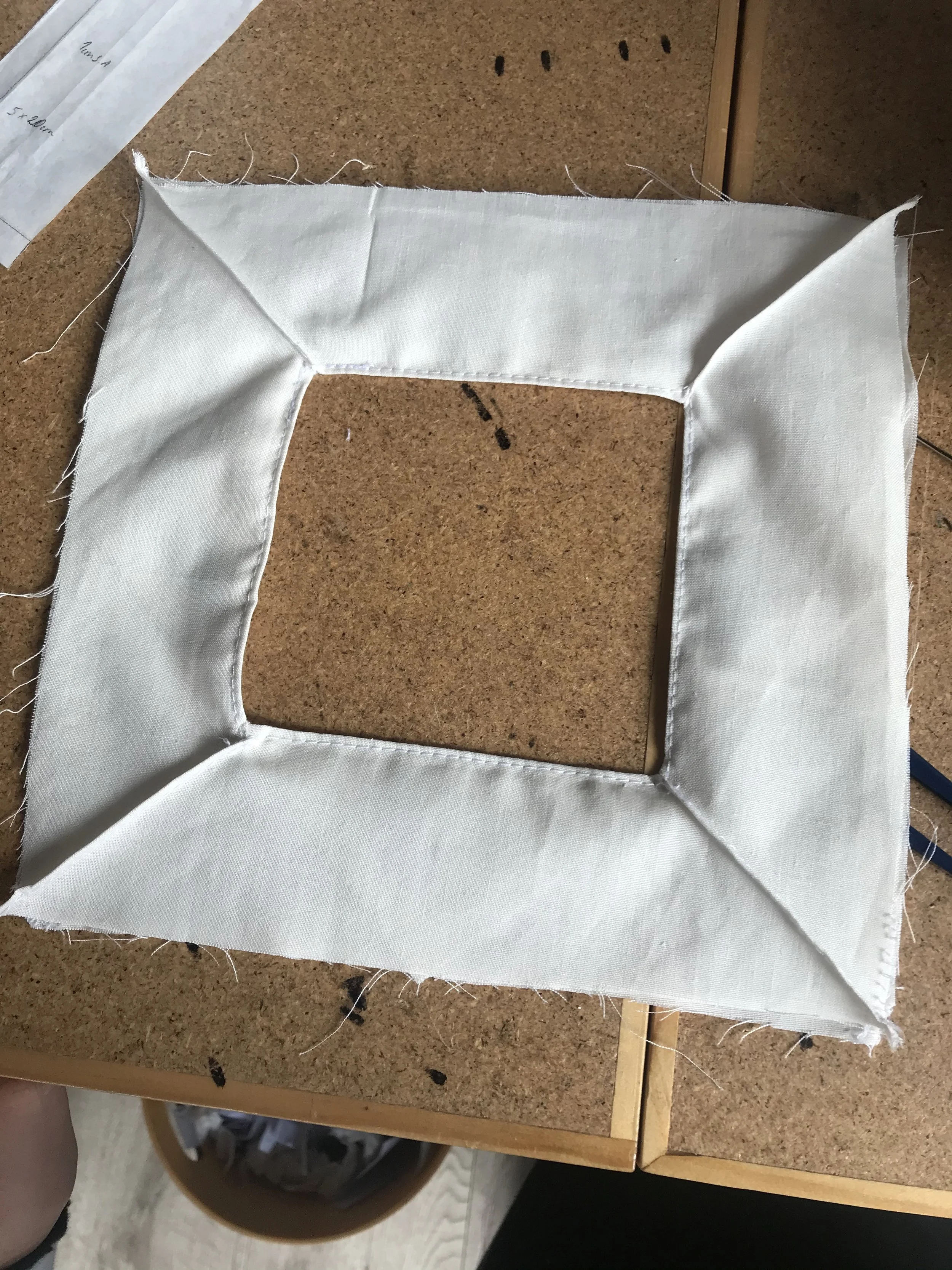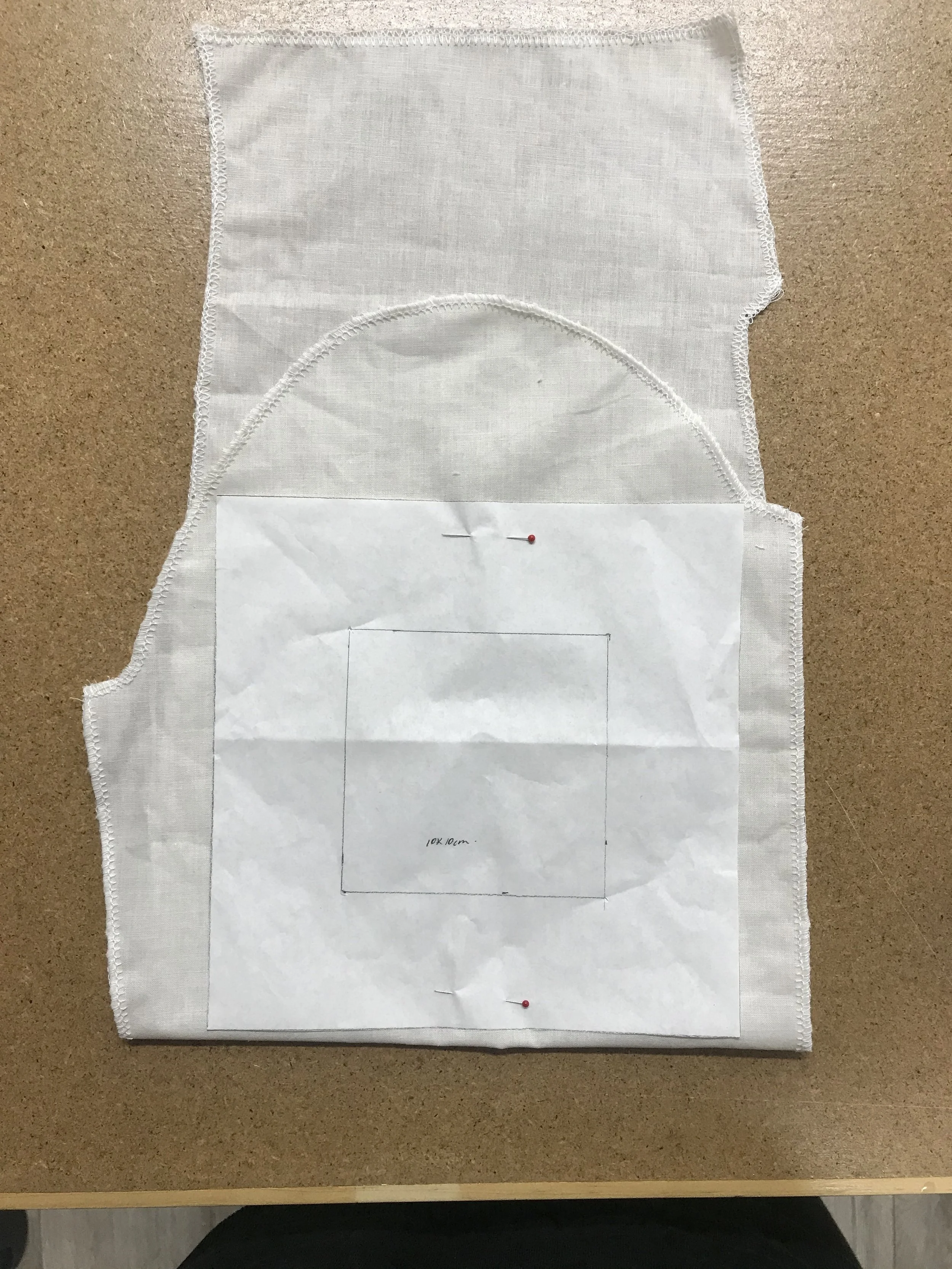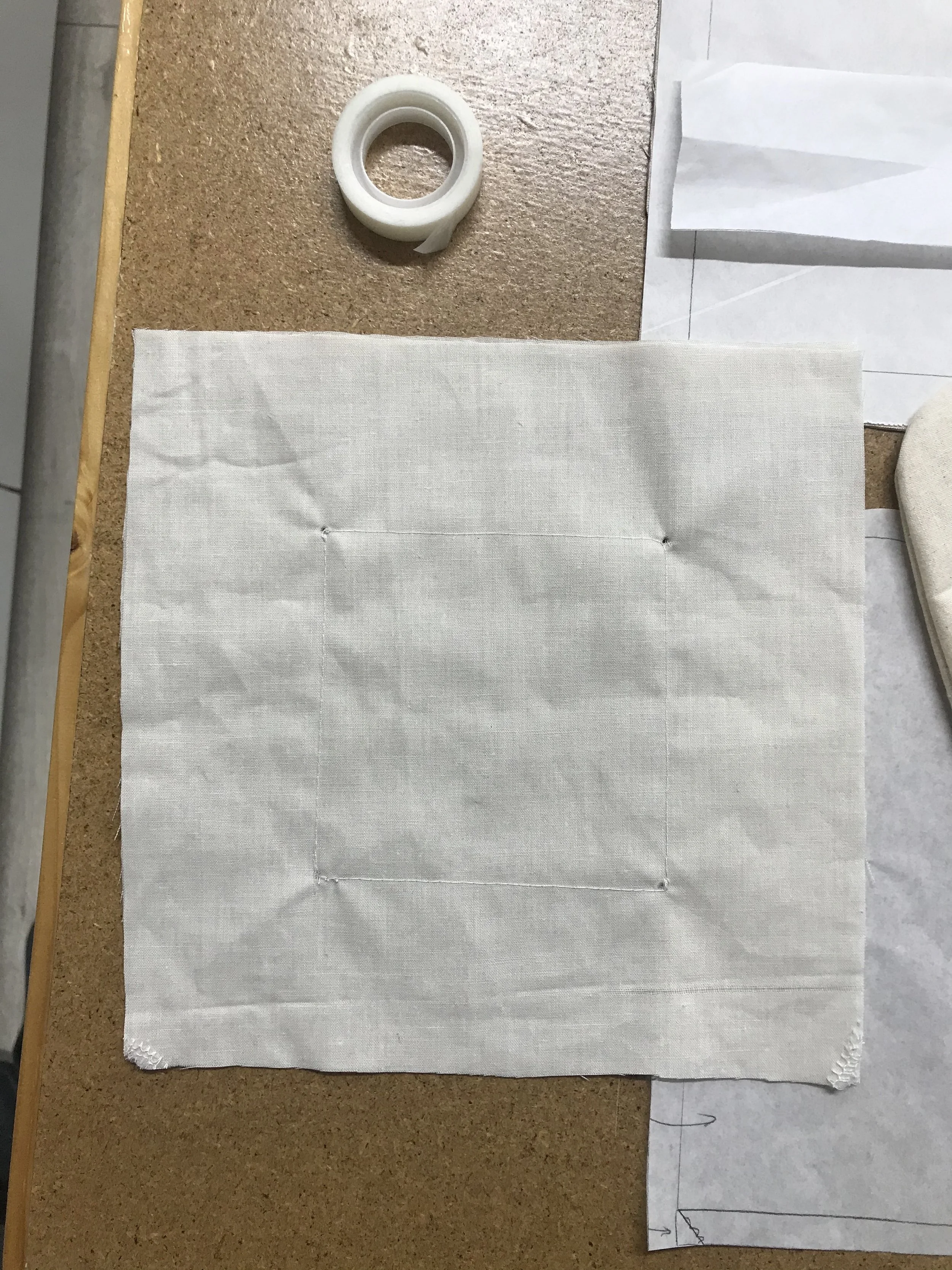20 x 20cm square with pin ticked diagonals and stuffed with grass seedlings, ready to be closed and stuffed with mulch