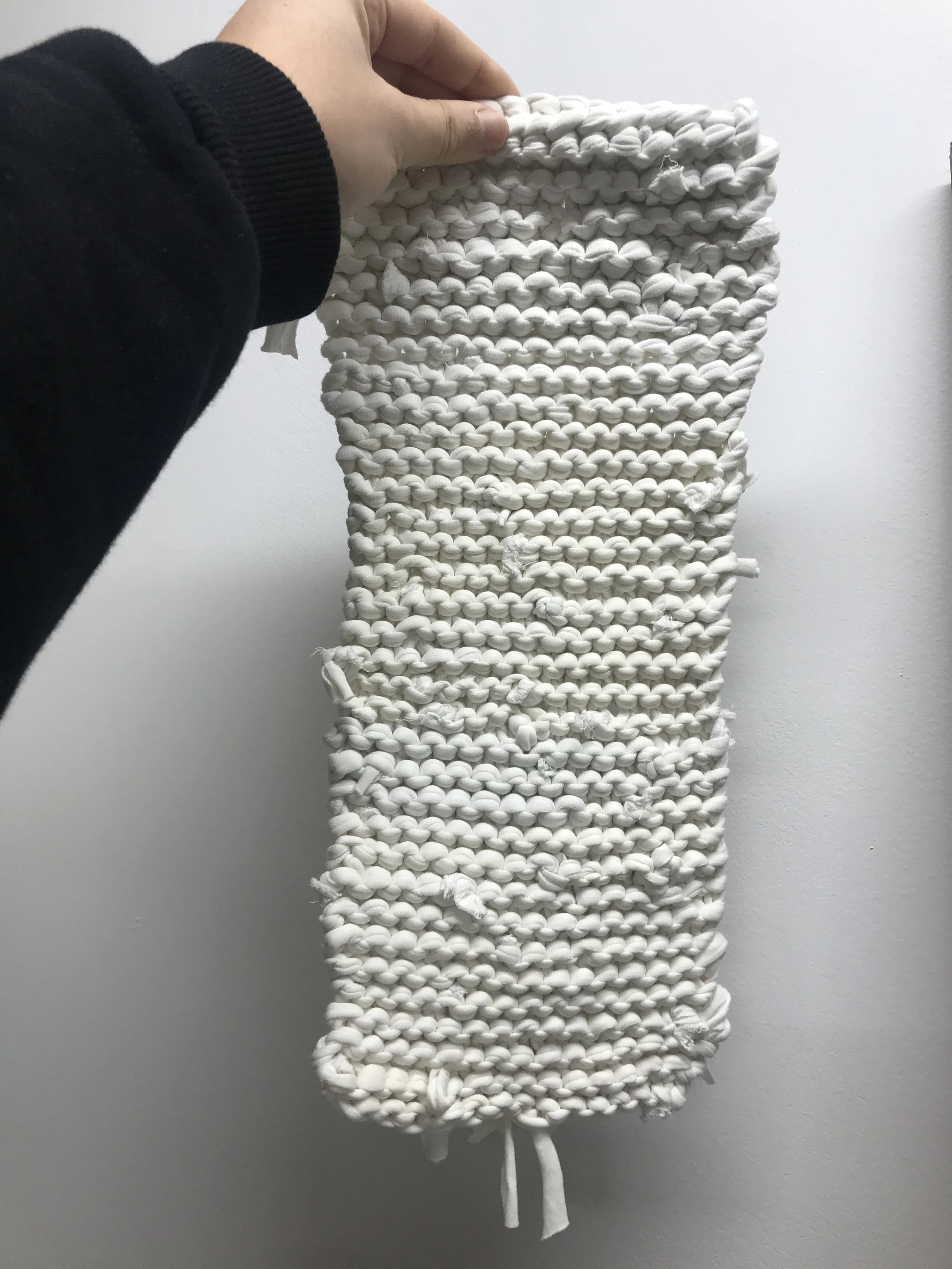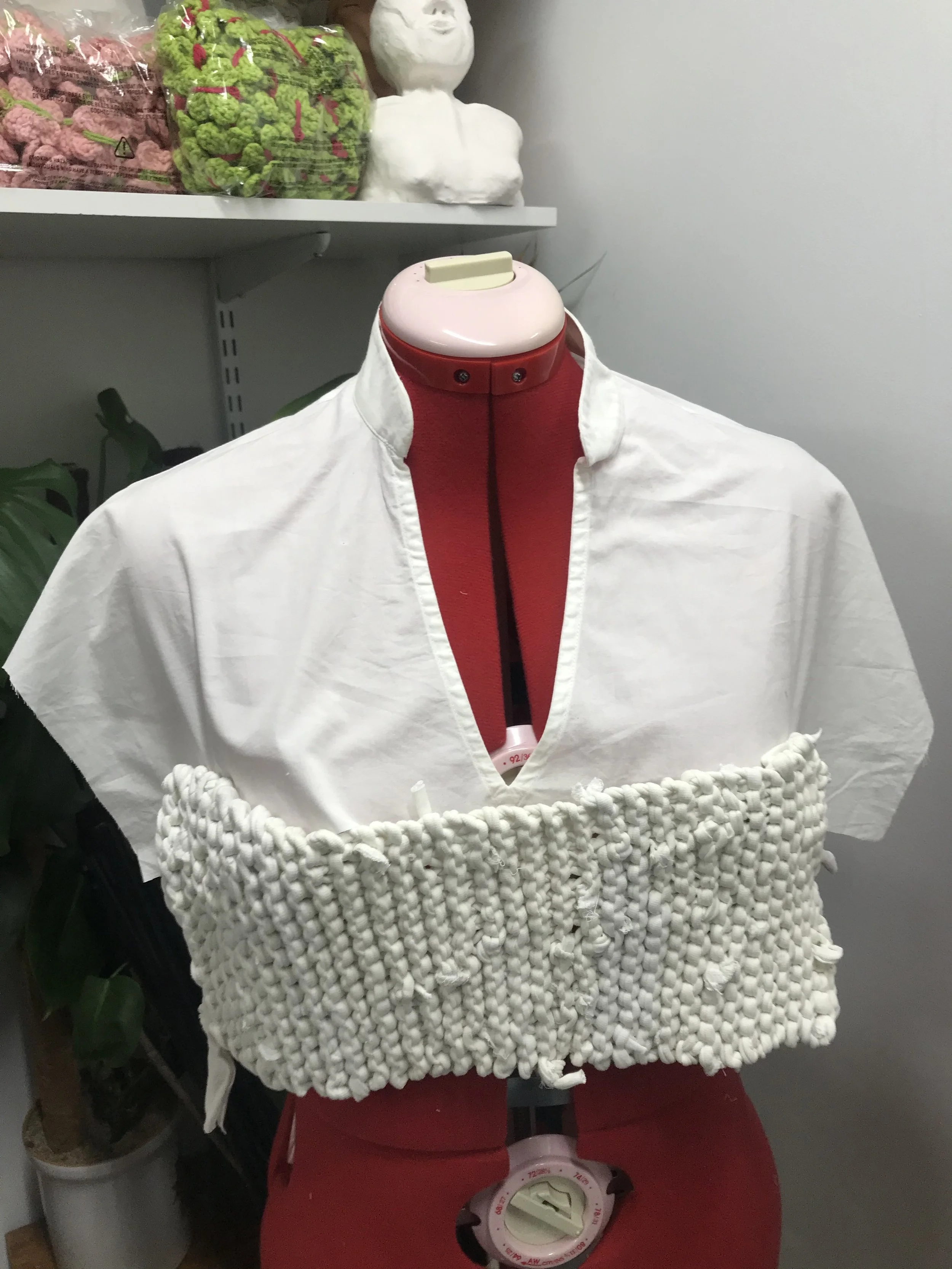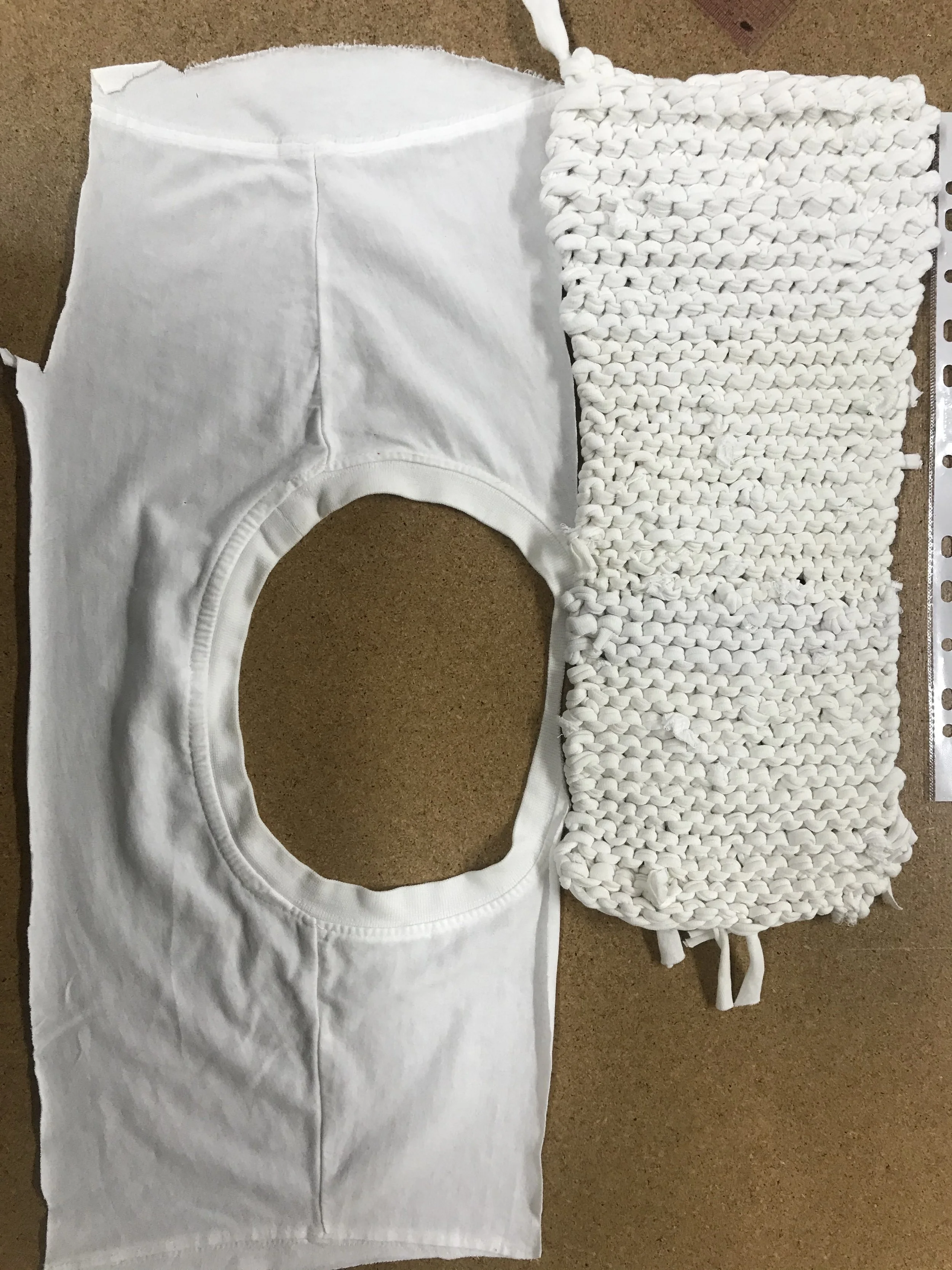 Reusing post consumer cotton T-shirts, sliced, pulled and rolled into T-shirt yarn, each strip has been tied to one another. Using the v neck collared shirt or T shirt ribbed hole as the base of this swatch to explore the placement and possibility of this outcome