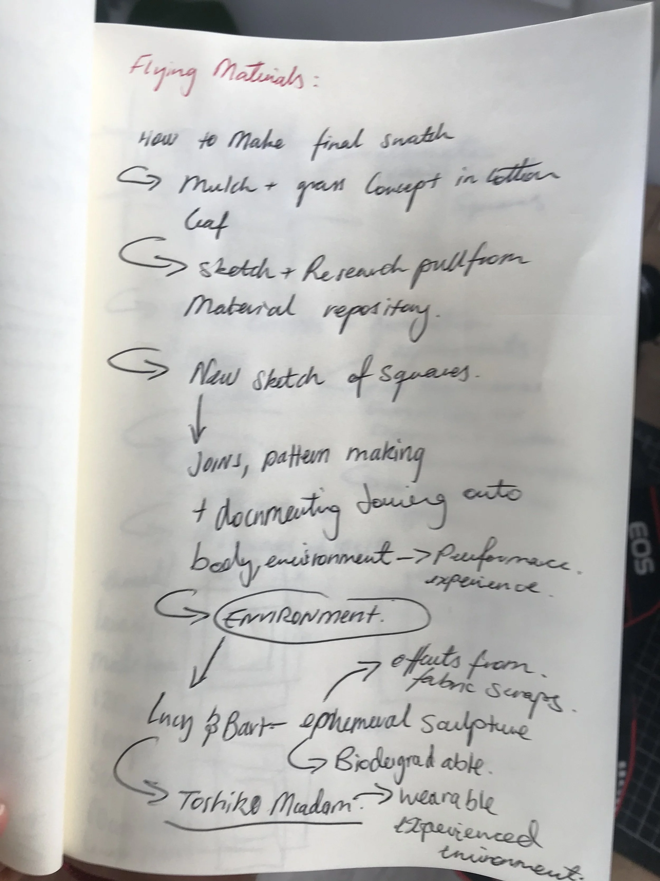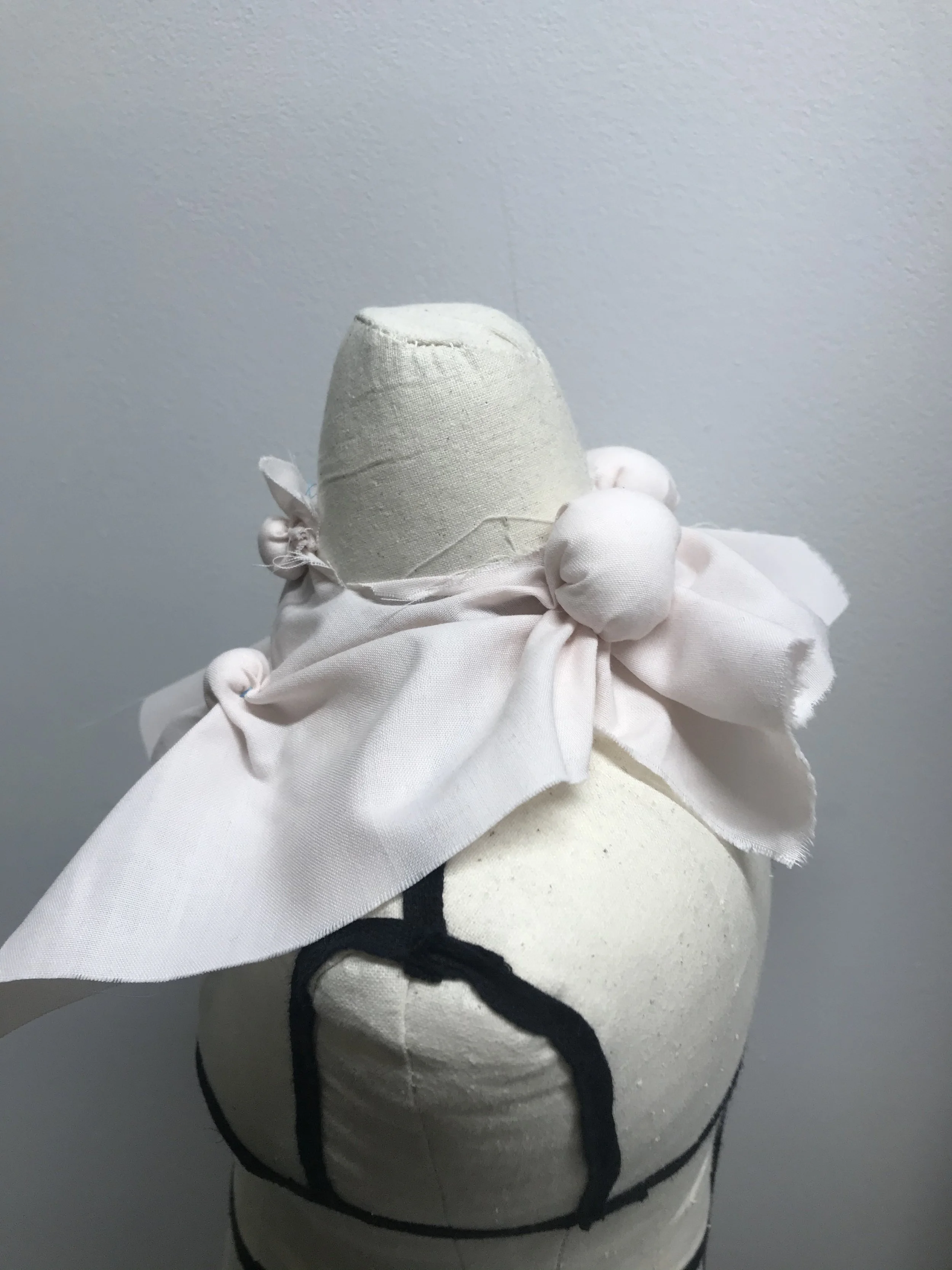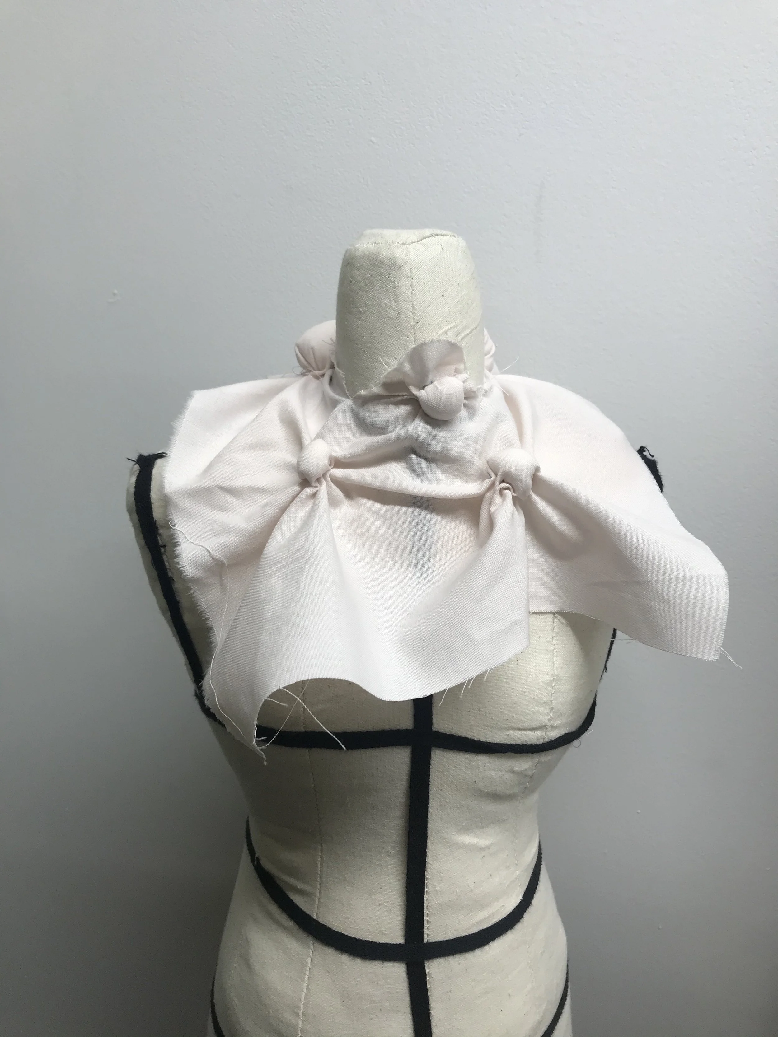 Preliminary sketch of quadrant design, based off the Issey Miyake pattern with additional volume surrounding the “neck line” and straps for wearers use. Volume puffs would be filled with Grass and Mulch to create a natural volume outcome that could biodegrade with wear and age.