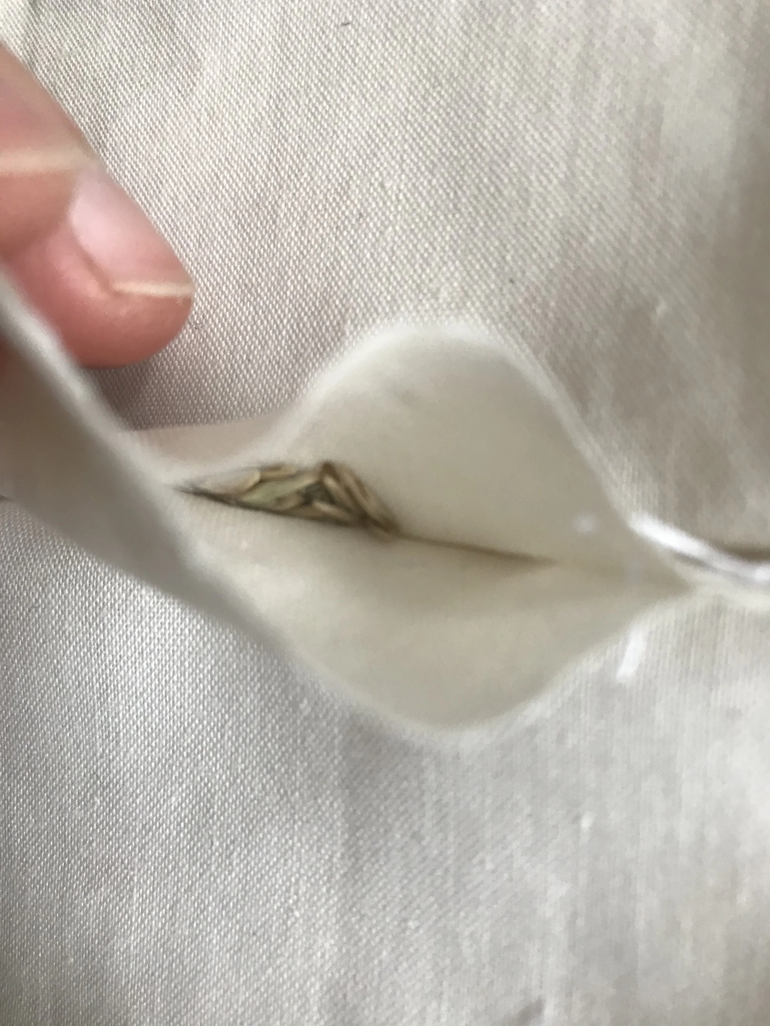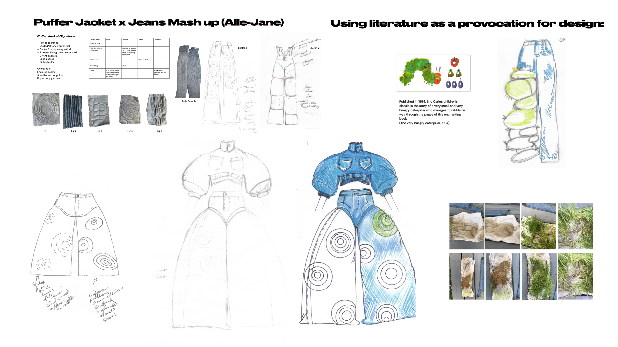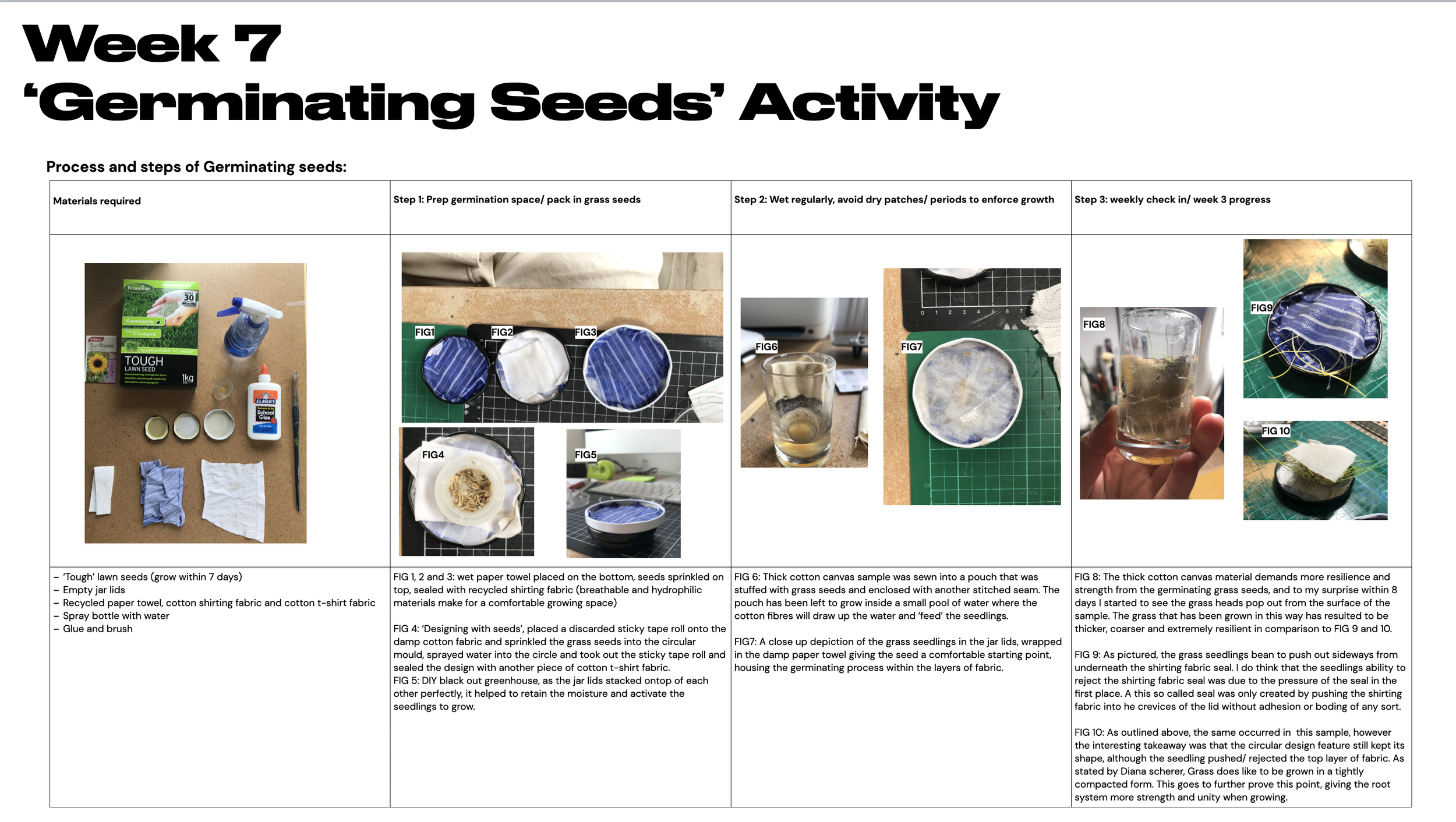 Previous research for Garment Design in 2021, lead me to explore volume by embedding and growing seedlings in cotton and denim swatches, from this exploration, I was able to gather the outcome that cotton as the encasing textile, allows and provides the perfect hydrophilic environment for seedlings to thrive and grow from. This has also informed the research and development of this swatch.