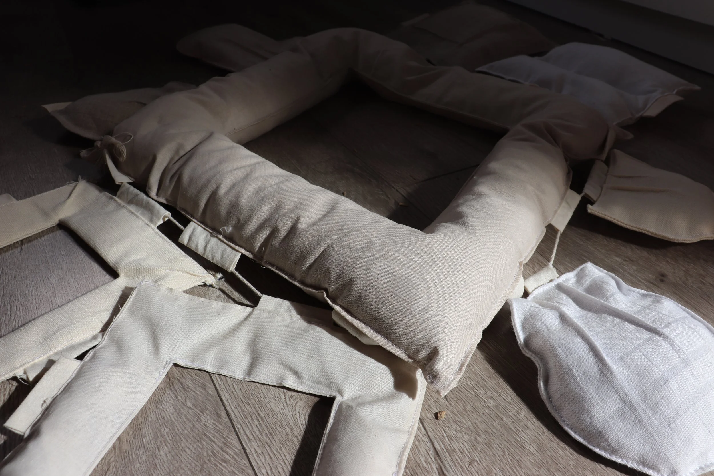 To create this final swatch, I wanted to focus on the element of form and volume. How to create and expand the original material swatches into a dynamic and freeform swatch that moulds and grows itself into its environment. The environmental outcome of this swatch is 100% biodegradable, as all textiles, threads and stuffing (sugarcane and grass) is 100% natural. Allowing the final form of the swatch to be ever evolving. until it’s final stage of life. All material used for this swatch was remnant or off cut fabric that was preowned or purchased, allowing the final swatch to be a recycled outcome that originated from “waste”.