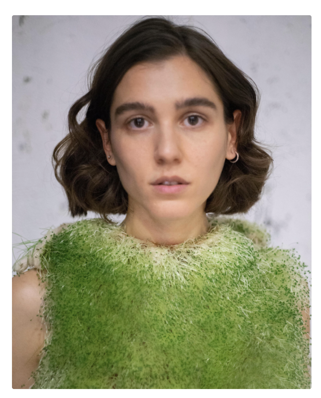 “Material driven designer, researcher and textile artist. Her practice blurs the boundaries between materials, technology and biology, proposing new perspectives on biocentric design” - Campos created her own methodology behind the knitted and woven garments that germinated seedlings from within the wool yarn, creating an 100% biodegradable garment that also serves as a co2, Clean indoor air by absorbing toxins, increasing humidity, and producing oxygen.