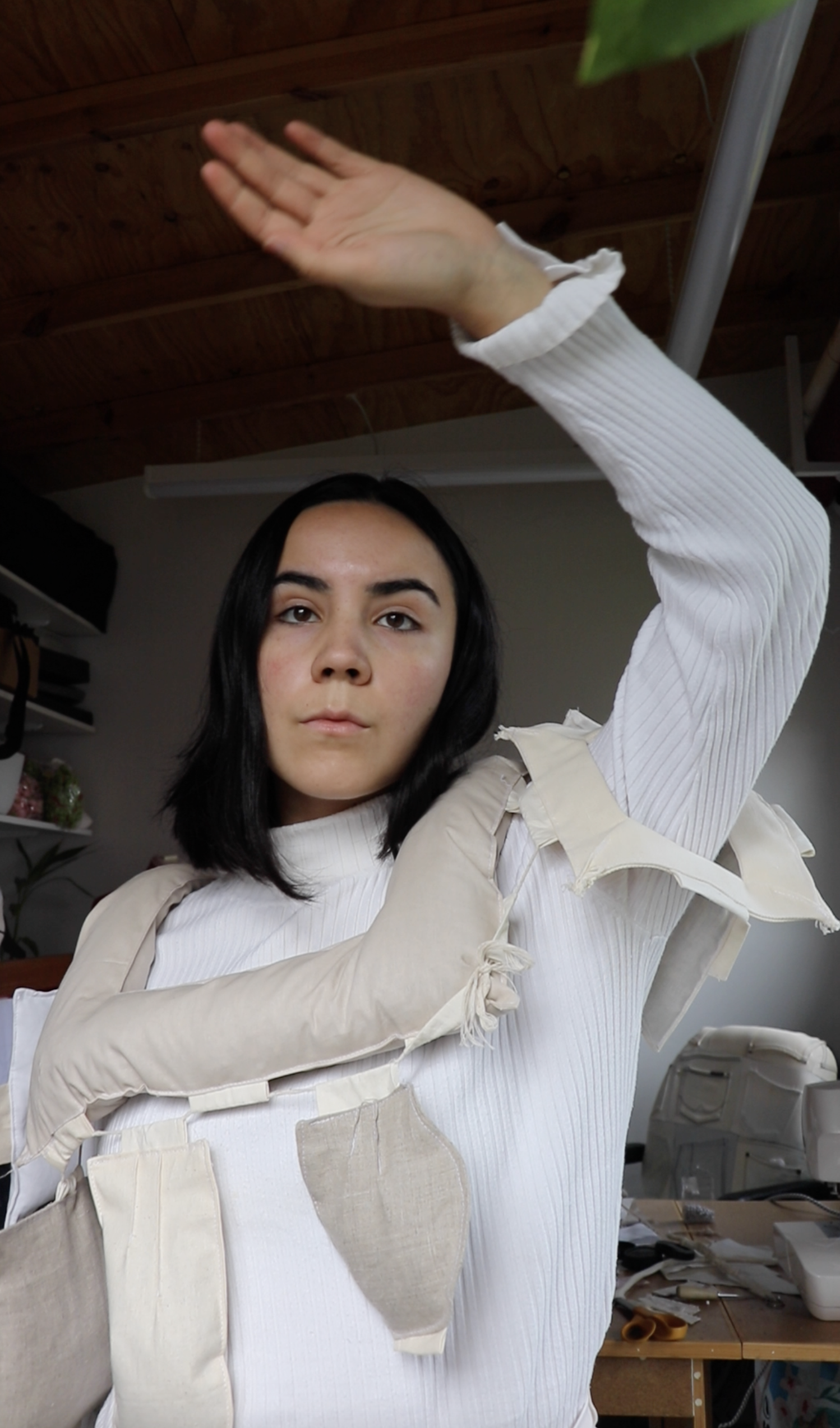 The final outcome can be worn on the body in any way that suits the wearer due to its adjustable nature. It can also be draped over furniture or be hung on the wall as a piece of art. The swatch embodies the use or the concept of fashion and materiality as an ephemeral experience that comes from nature and back to nature.