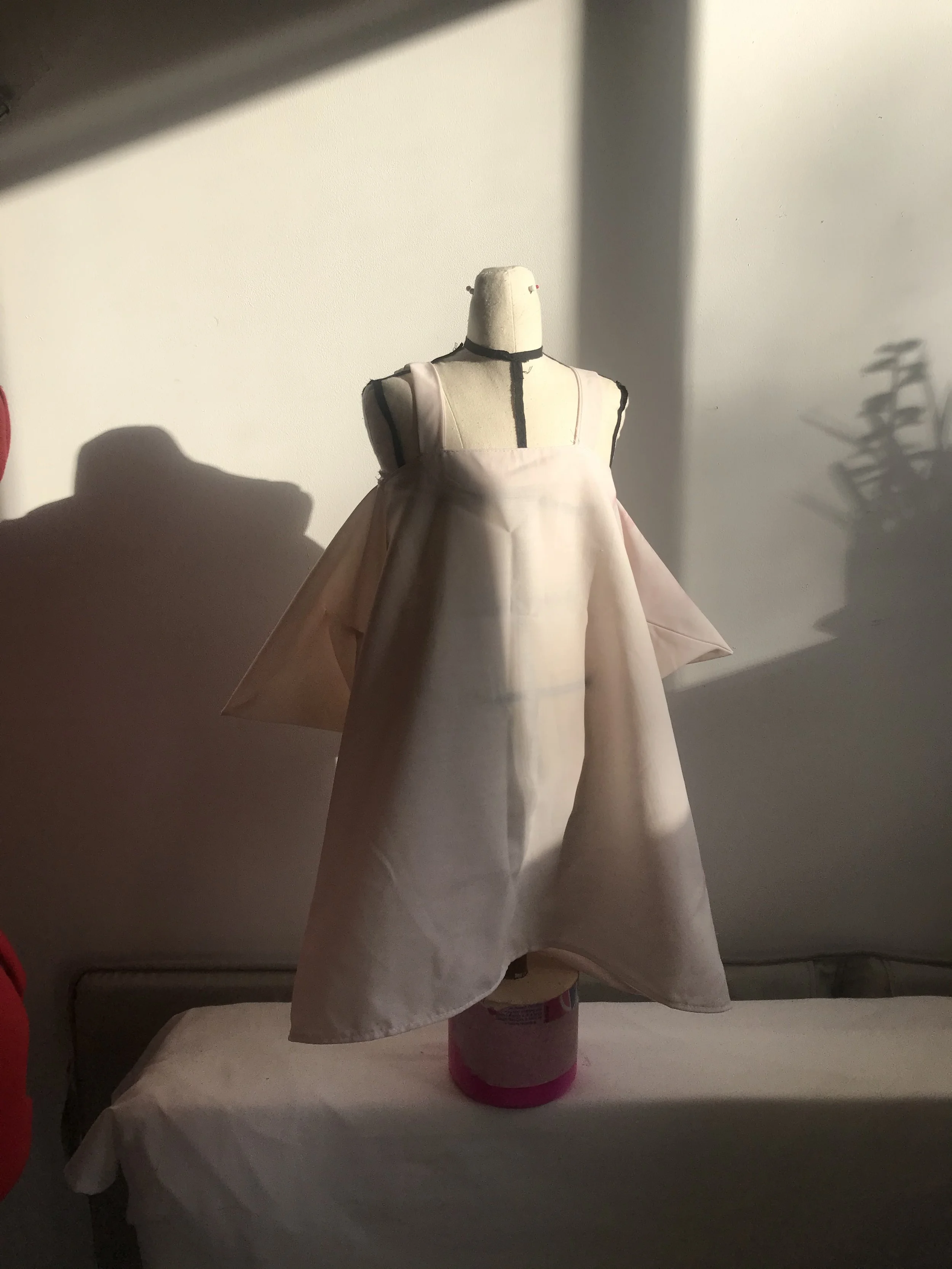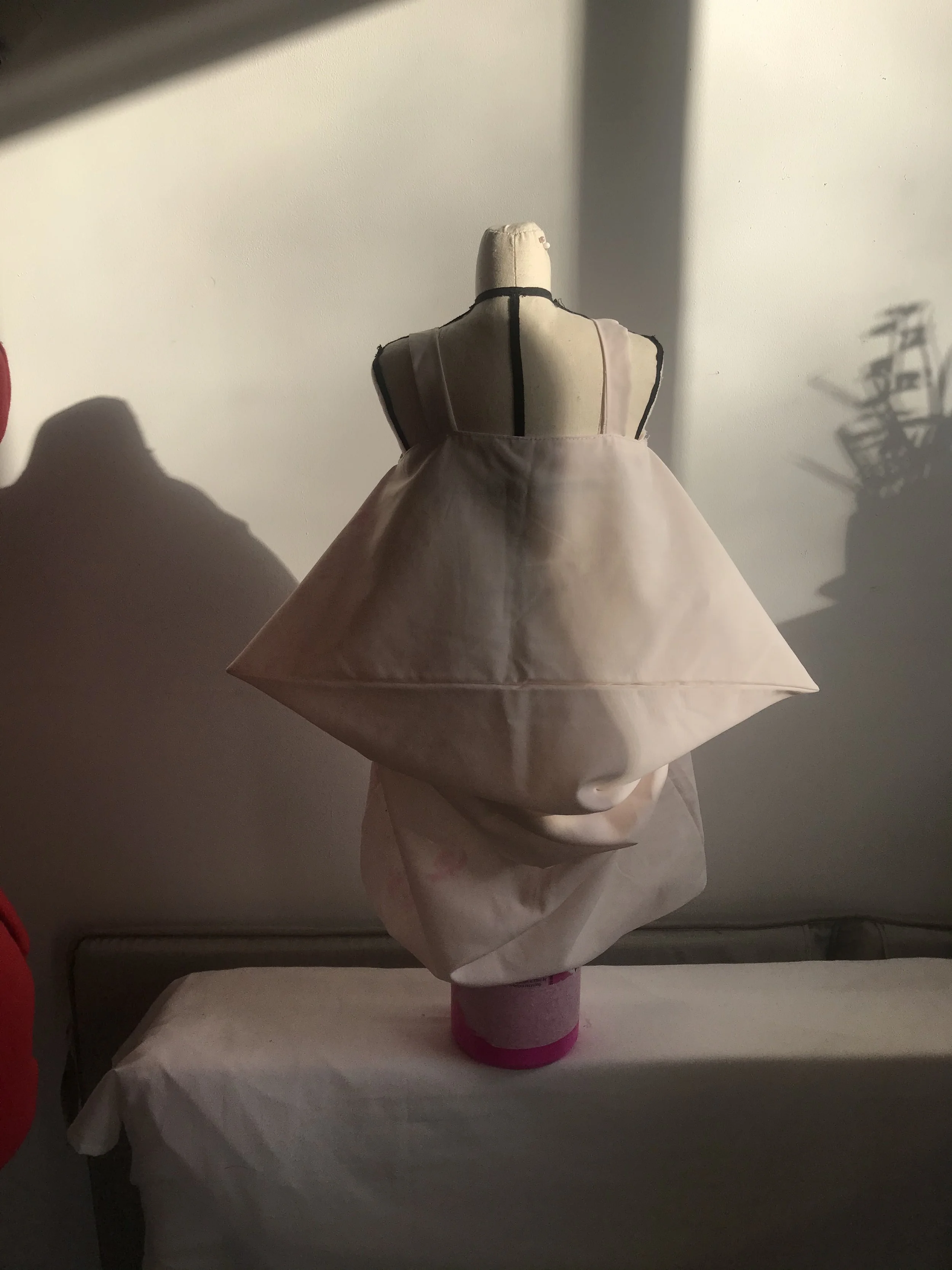 I have reimagined Pongee (Synthetic) through the use of vertical and horizontal pin-tucks, causing the material to be reinforced and structured.