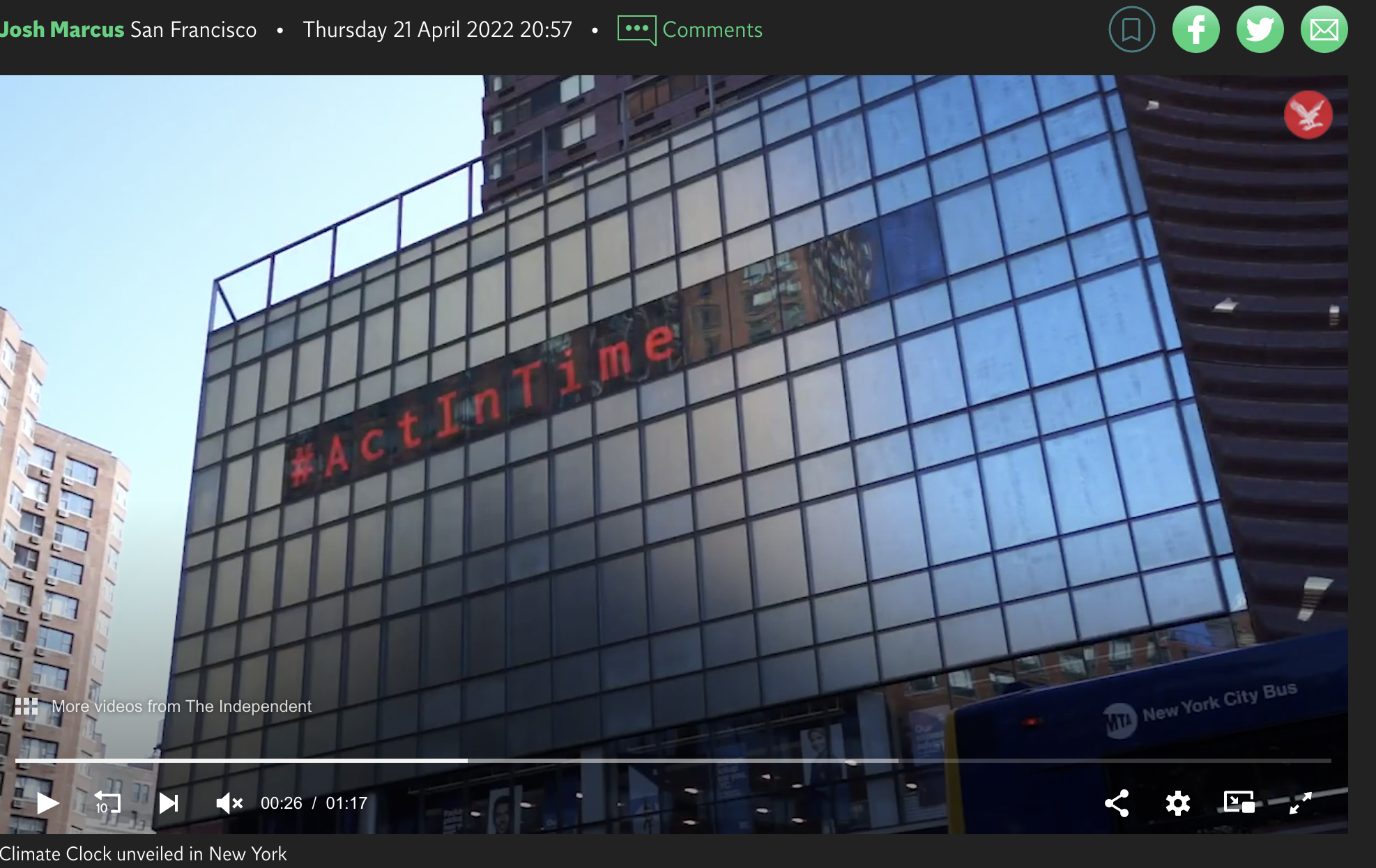 “The Climate Clock melds art, science, technology, and grassroots organising to get the world to #ActInTime.The project is centred on a simple tool: a clock that counts down the critical time window to reach zero emissions (our “Deadline”), while tracking our progress on key solution pathways (“Lifelines”) - Climate clock,2022