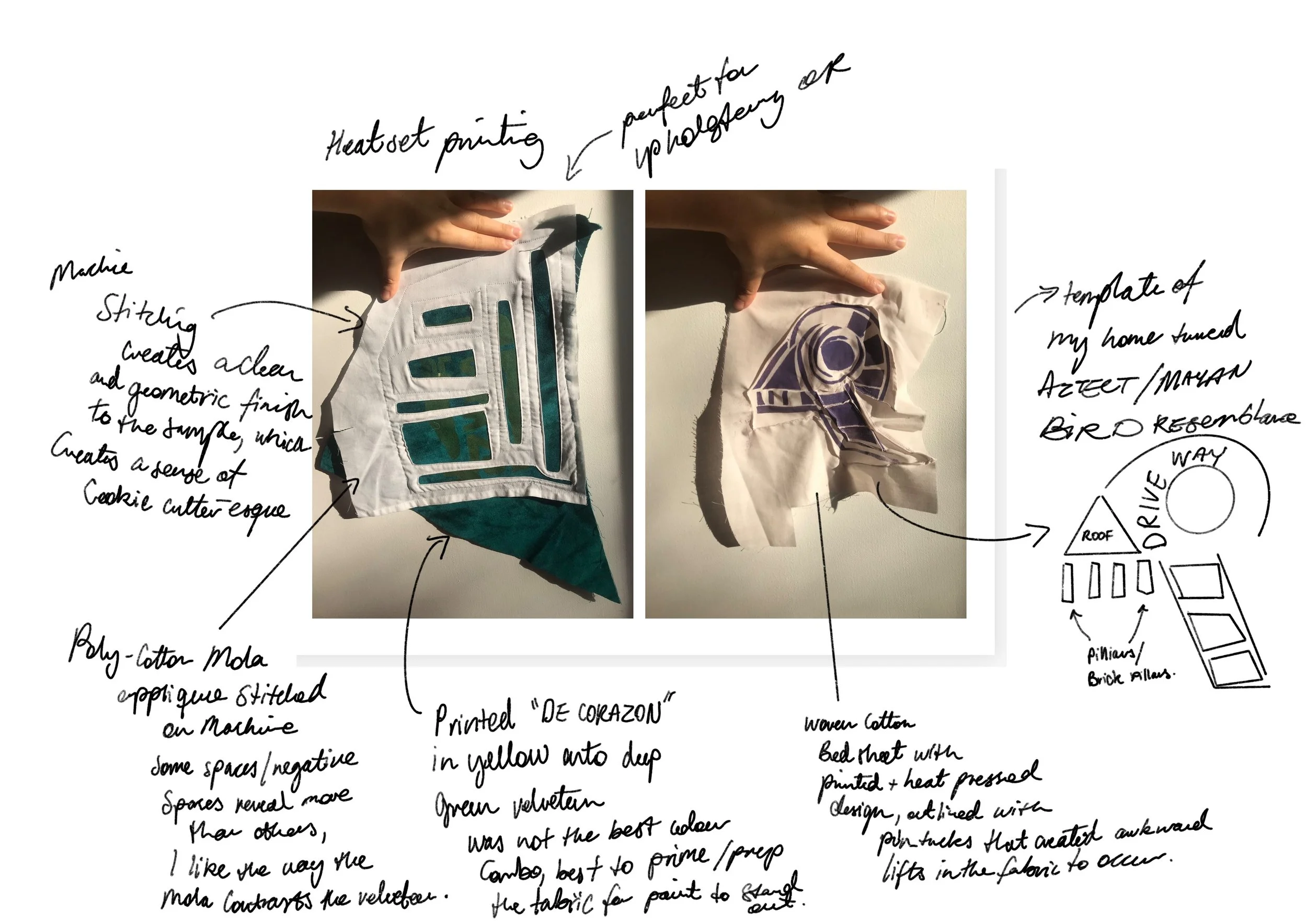 Printed velveteen sample used in a Poly cotton top, velveteen bottom layer Mola sample: Best suited for over shawls, vests and upholstery. I did thoroughly like the spacing between each rectangle and the finish that was achieved on the machine. The repetition of squares allowed for the visual interest of the negative space to shine through