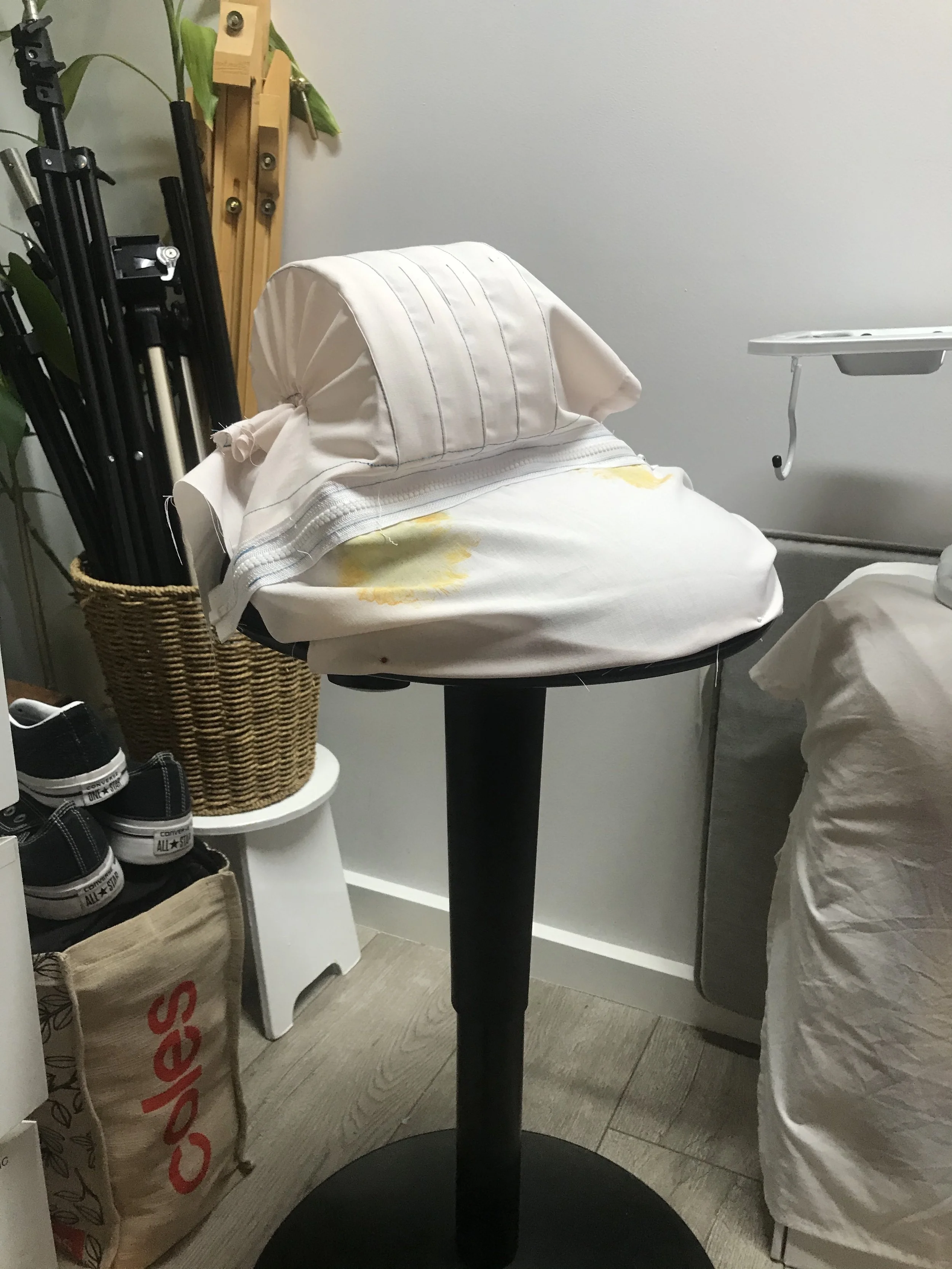 Incorporated boning in quadrant with zipper, anchored on the top of the curved standing chair, creates an interesting tail bone support and/or uncomfortable ways of sitting on a chair