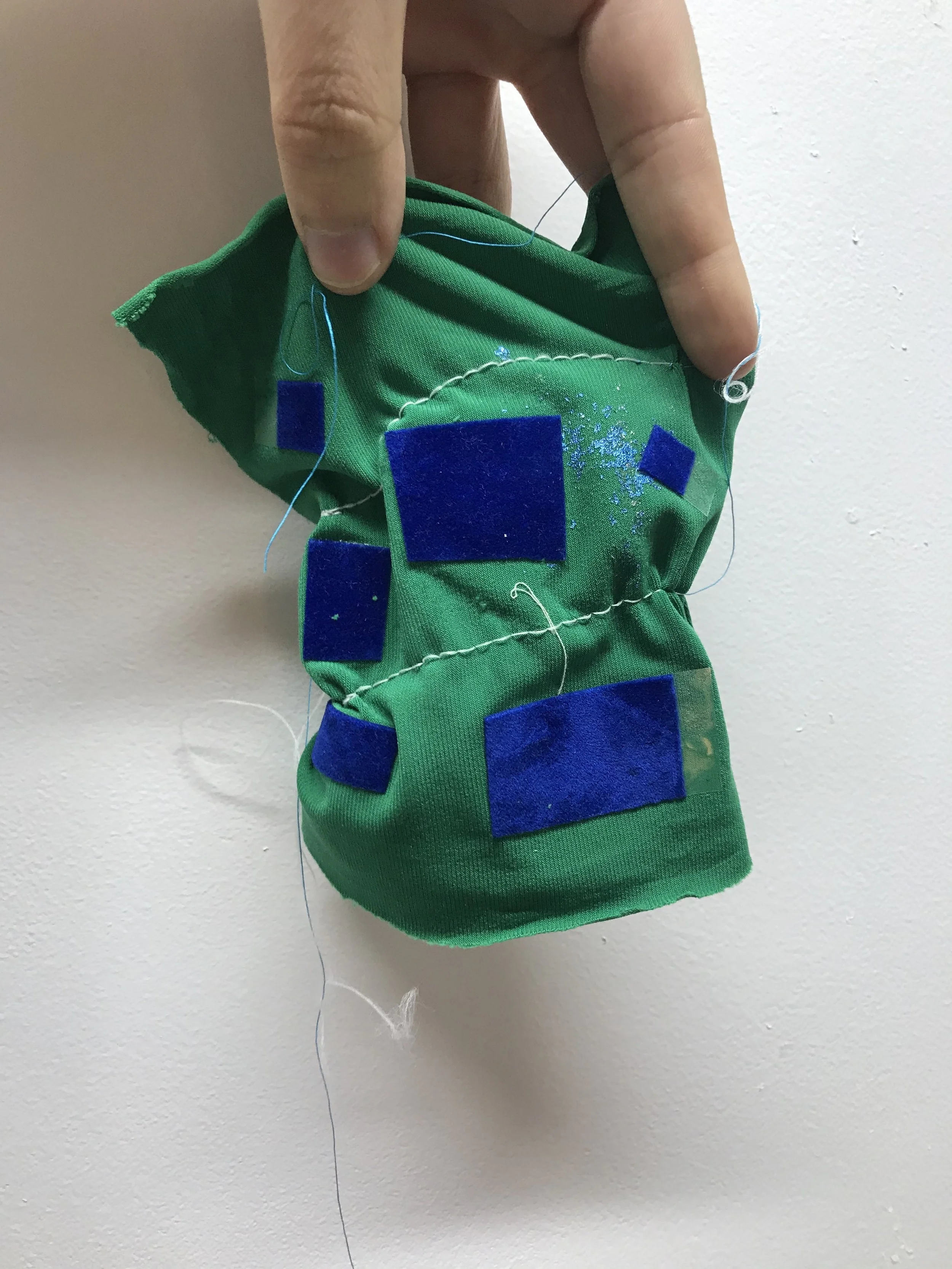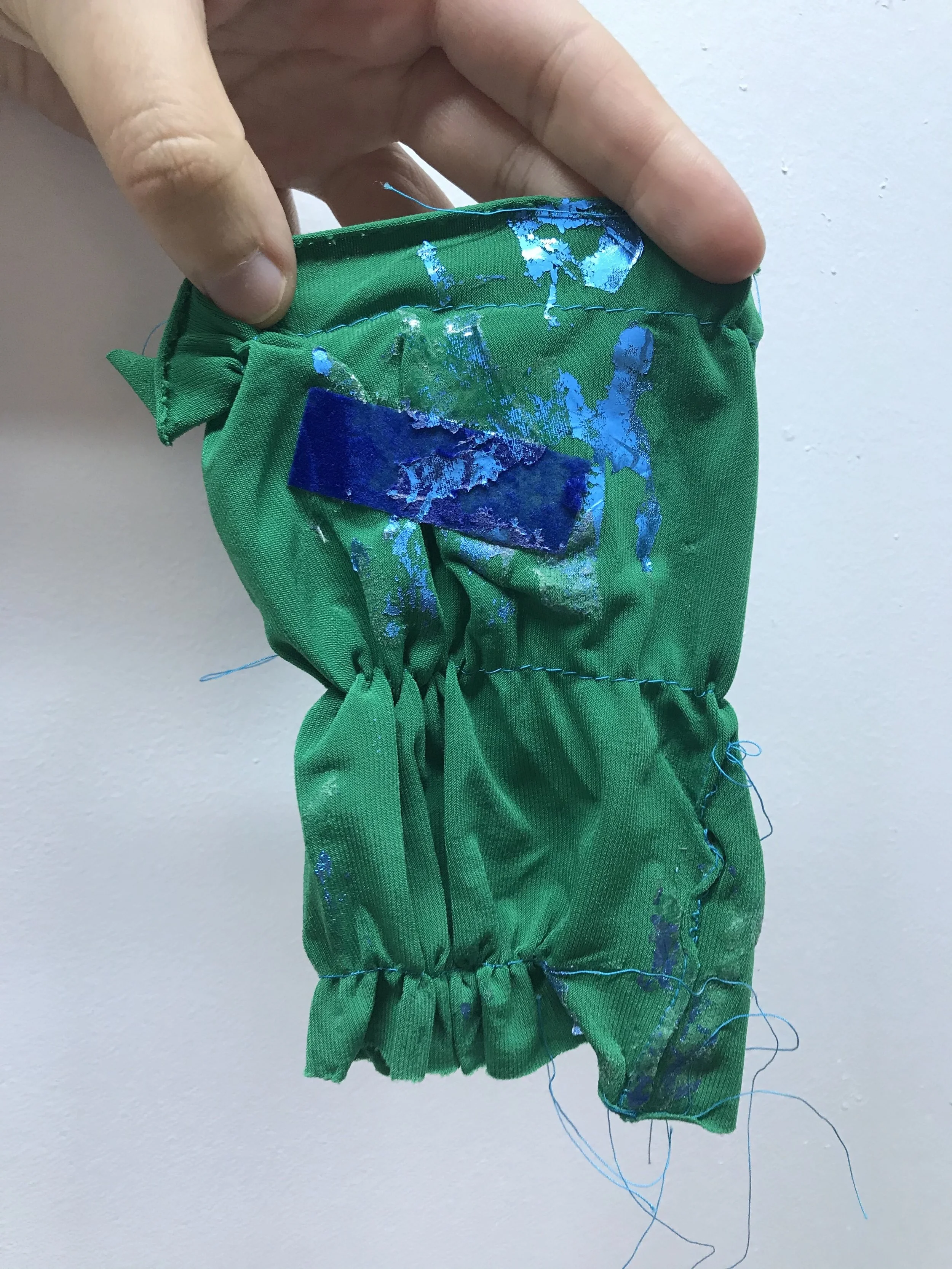 Stretch polyester sample with embedded felt rectangle and foil overlay: Gathering turned out a little better however the foiling and the glue created stiffened areas that affected the soft handle of the fabric