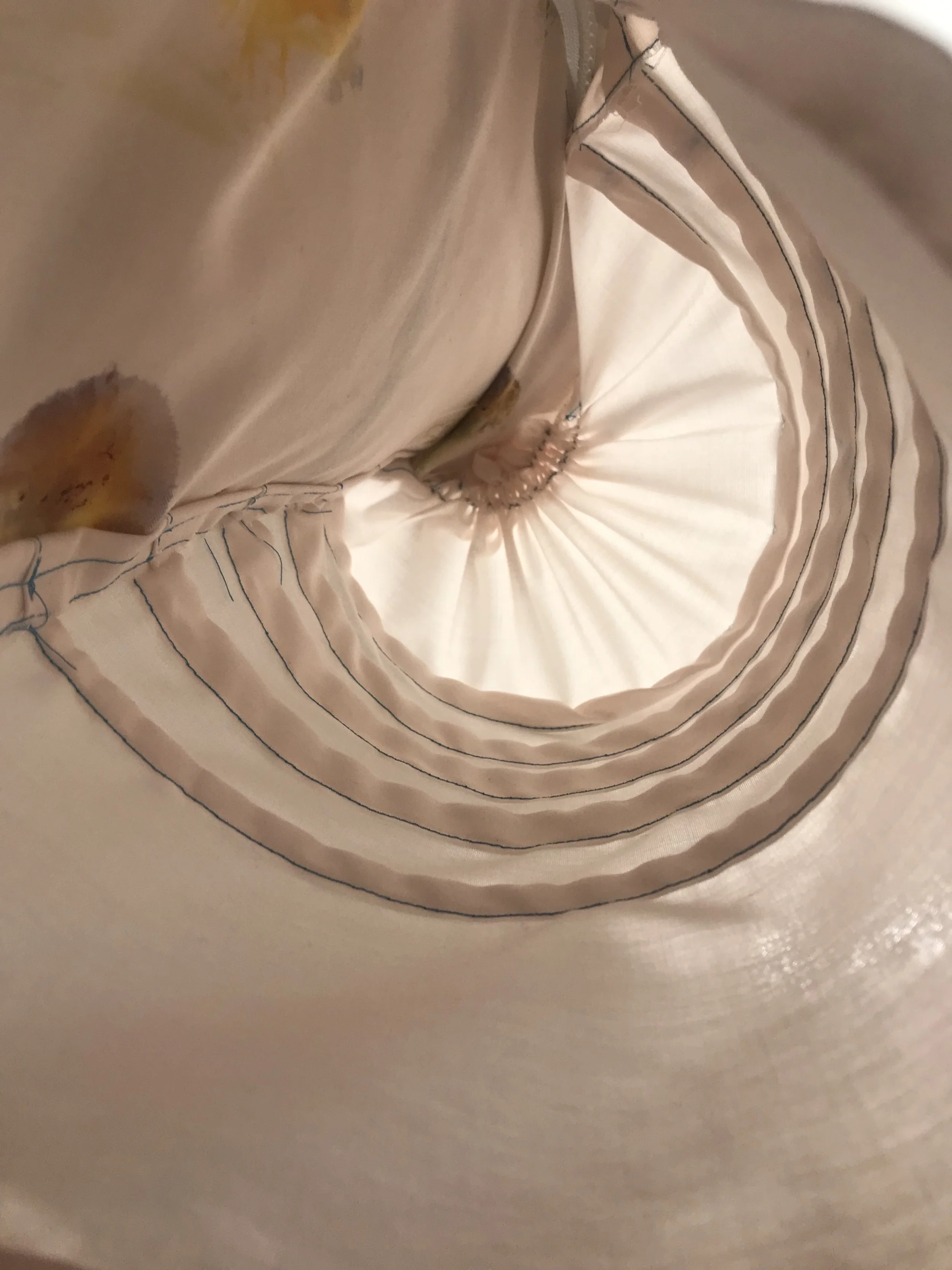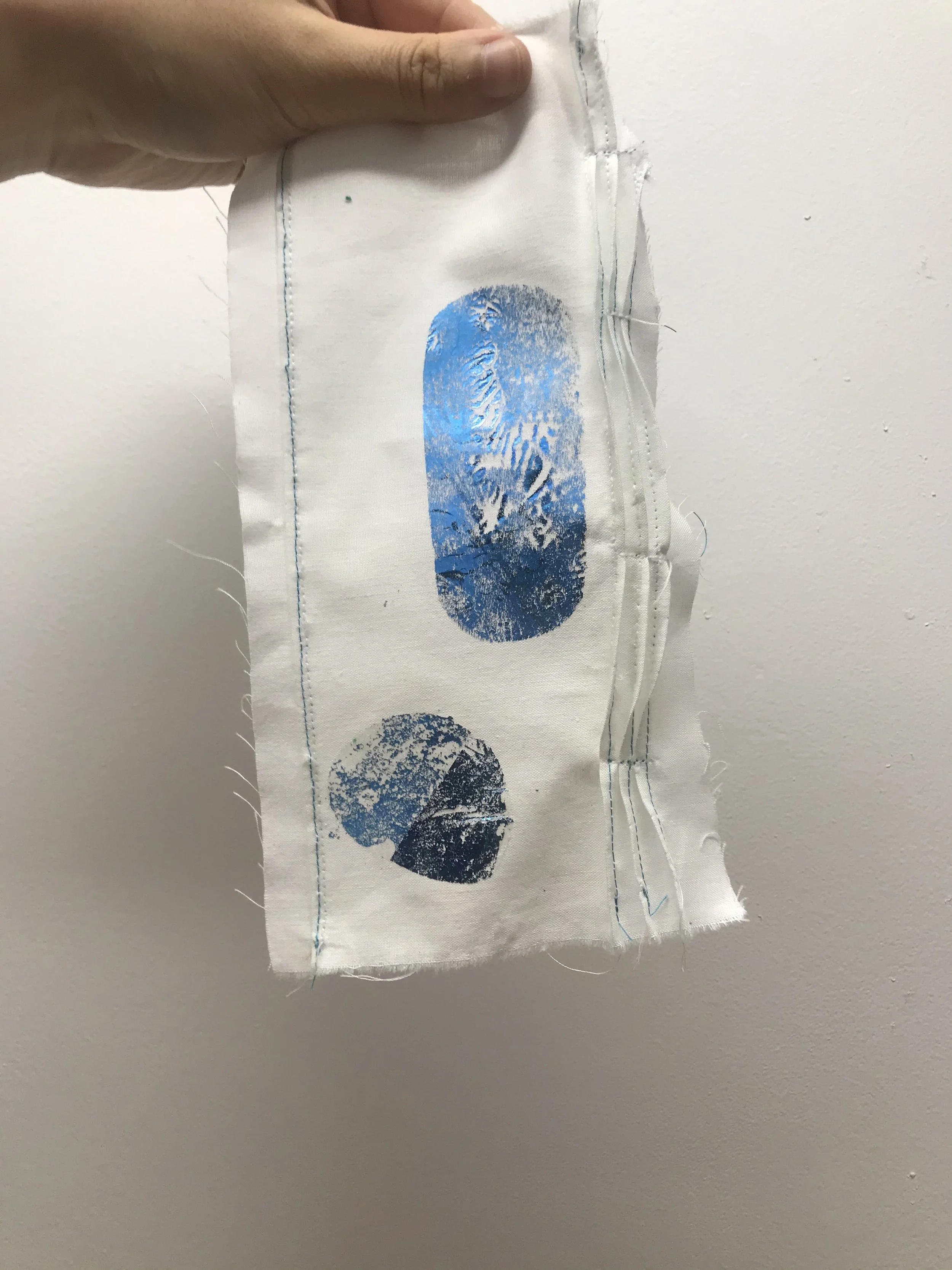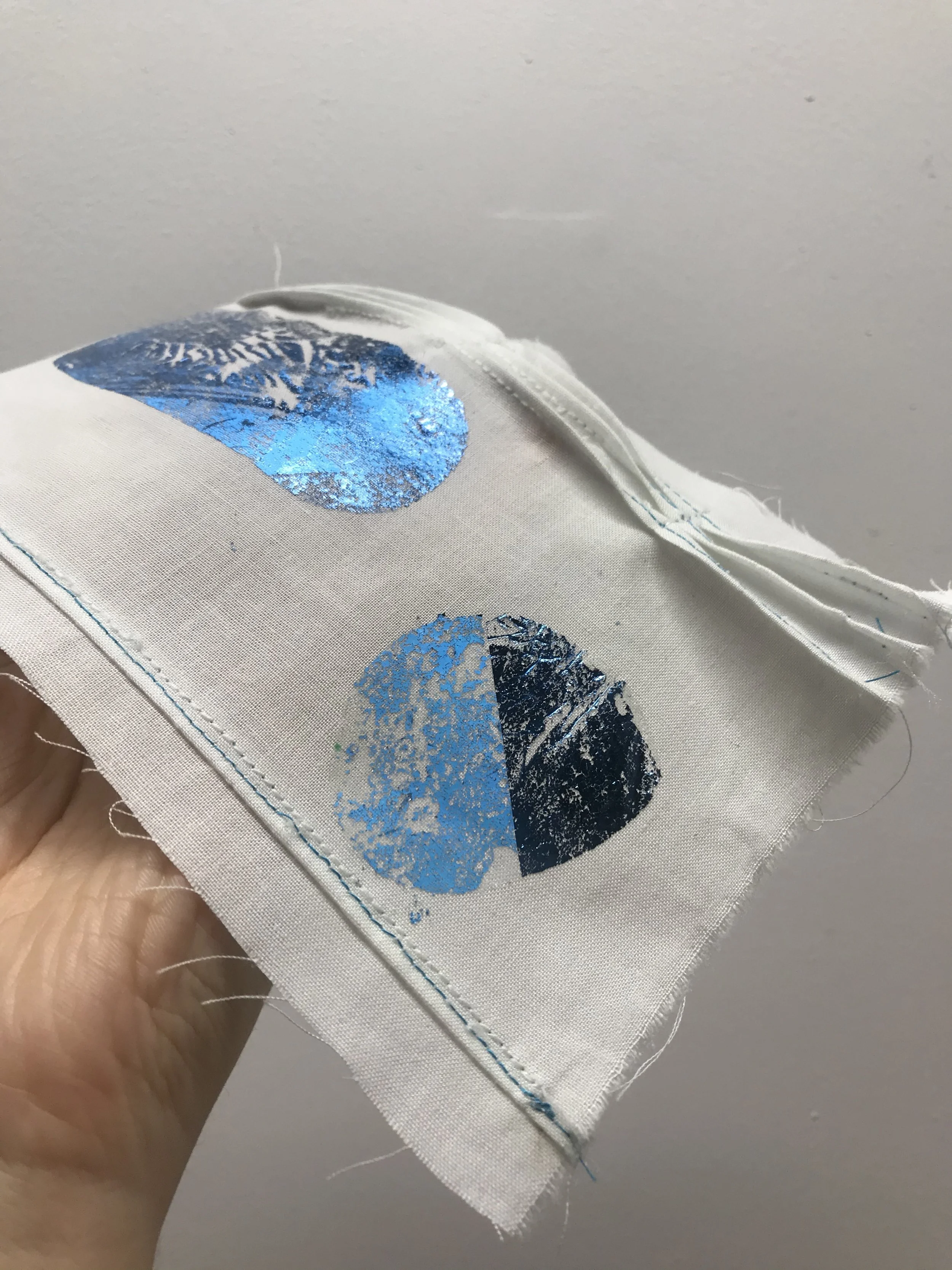 Pin-tuck and Mexican pleated cotton sample with foiled oval and circle that turned out better than my first trial on the stretch fabric