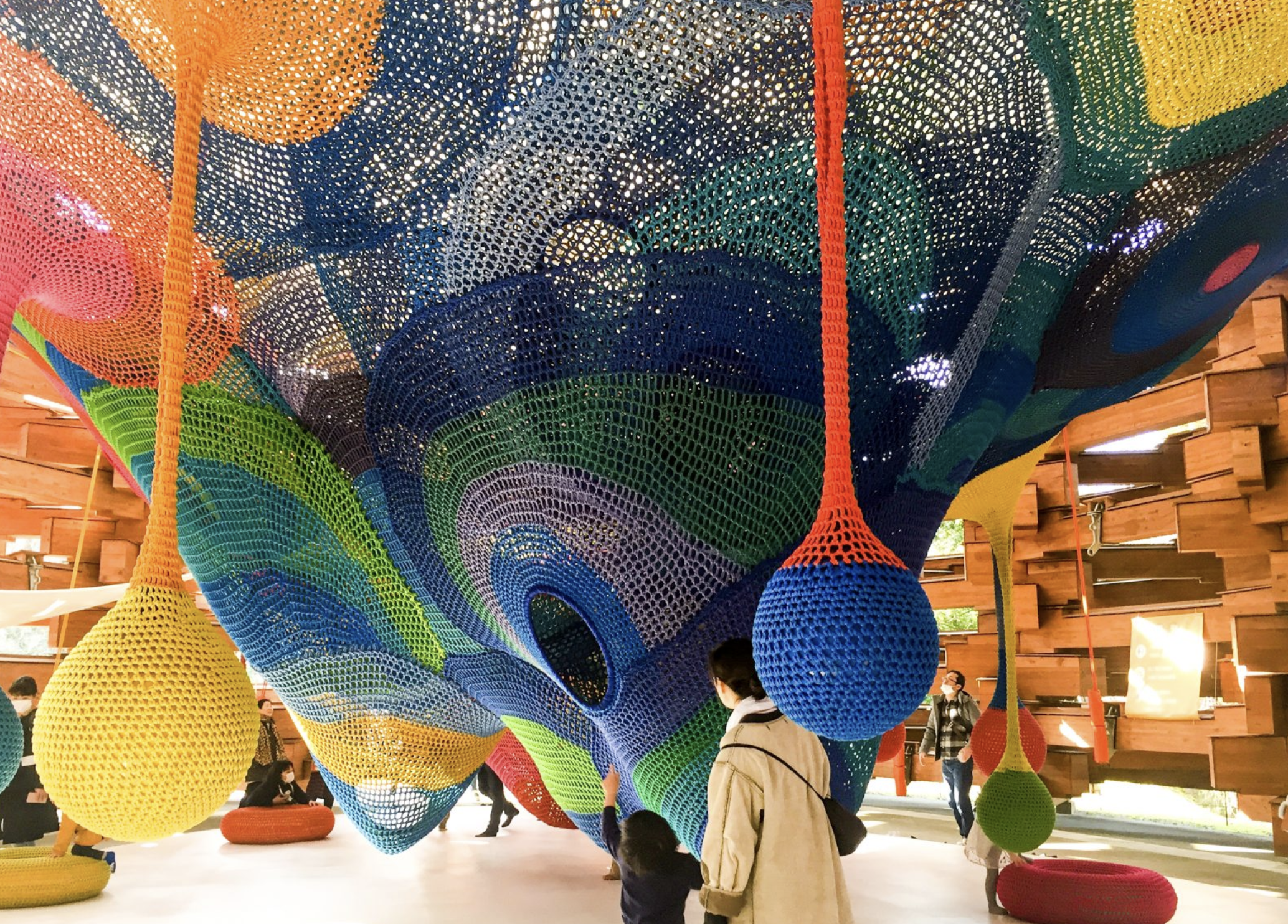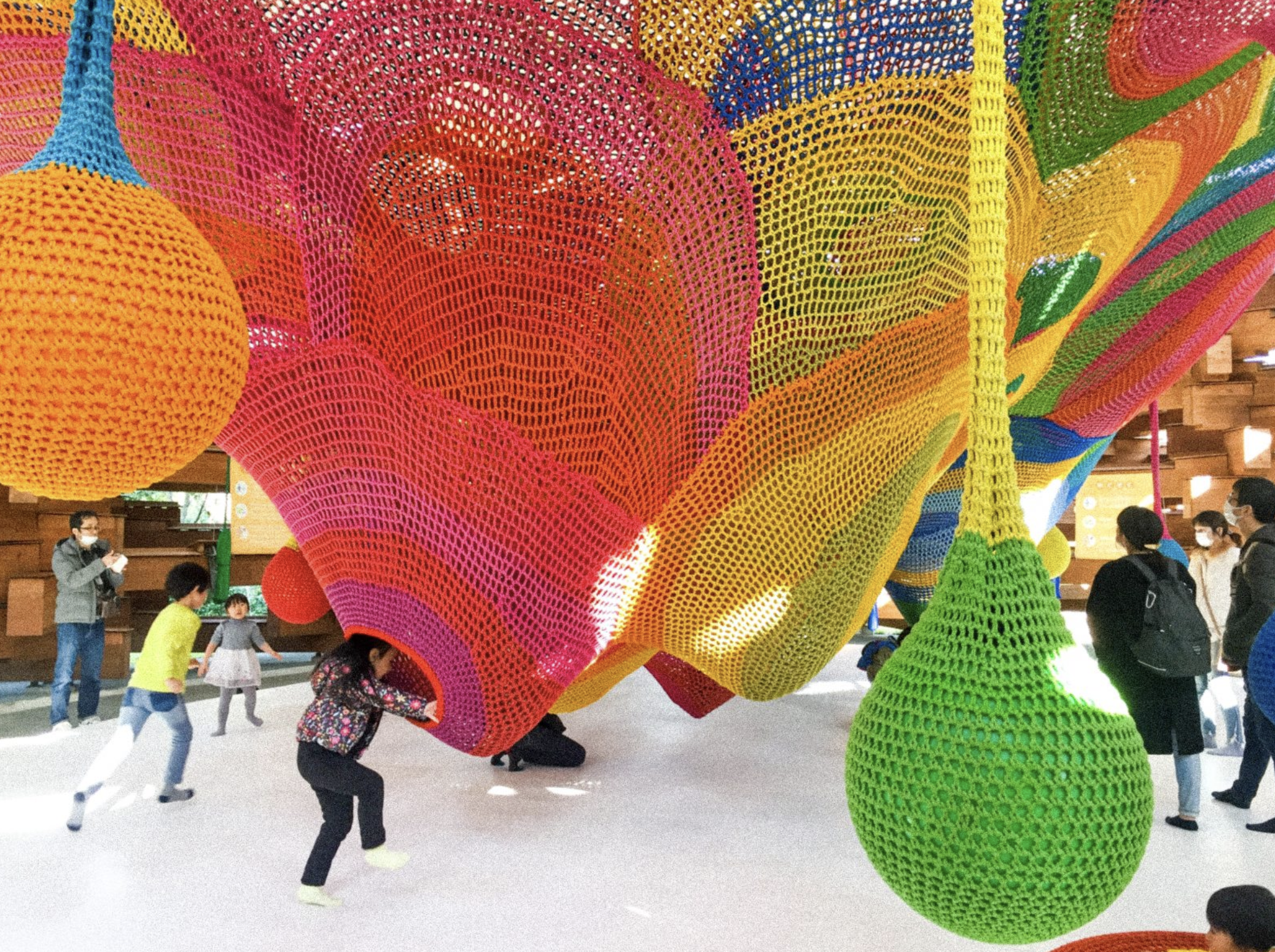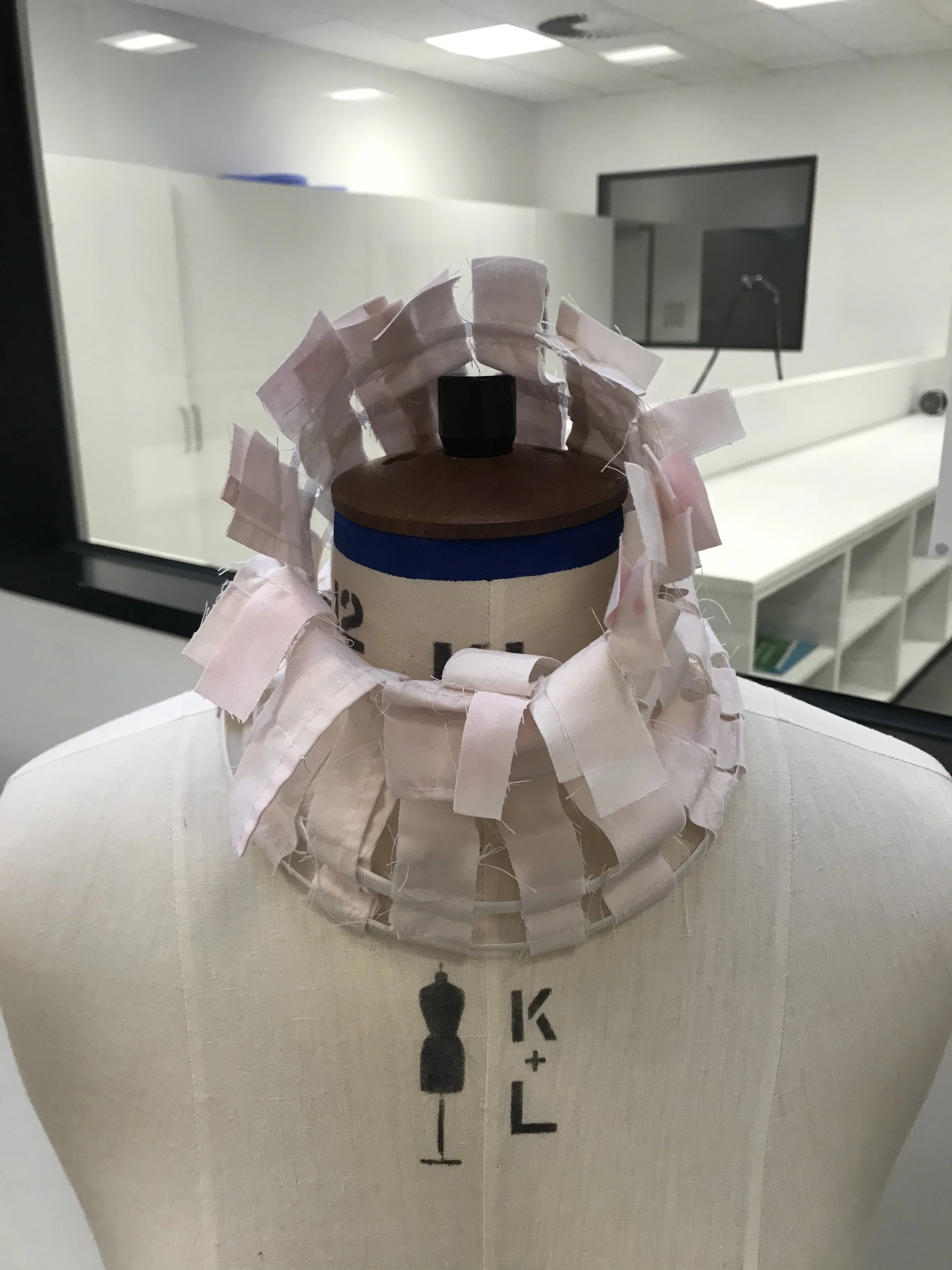 Japanese textile artist Toshiko Macadam is best known for her work with large-scale textile structures, such as "textile playgrounds" for children, brightly coloured net-like structures of crocheted and knotted nylon”. This playful experimenting of material and environment can be explored further through boning and the environment - how volume and space create a relationship when forced together