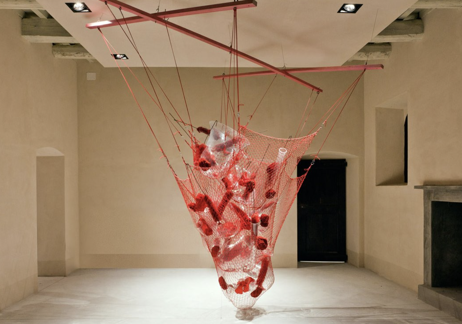 The way Tunga would embed artefacts into his netting works quite literally, allows for the original artefact/ object to be highlighted and viewed in relation to the scale of the installation. A take away from Tunga would be to explore scale and embedding in a more literal manner rather than pressed felt; the shibori sample takes this concept into account, as the spoon sample did recreate the “embedding” concept with the 3D shibori technique.