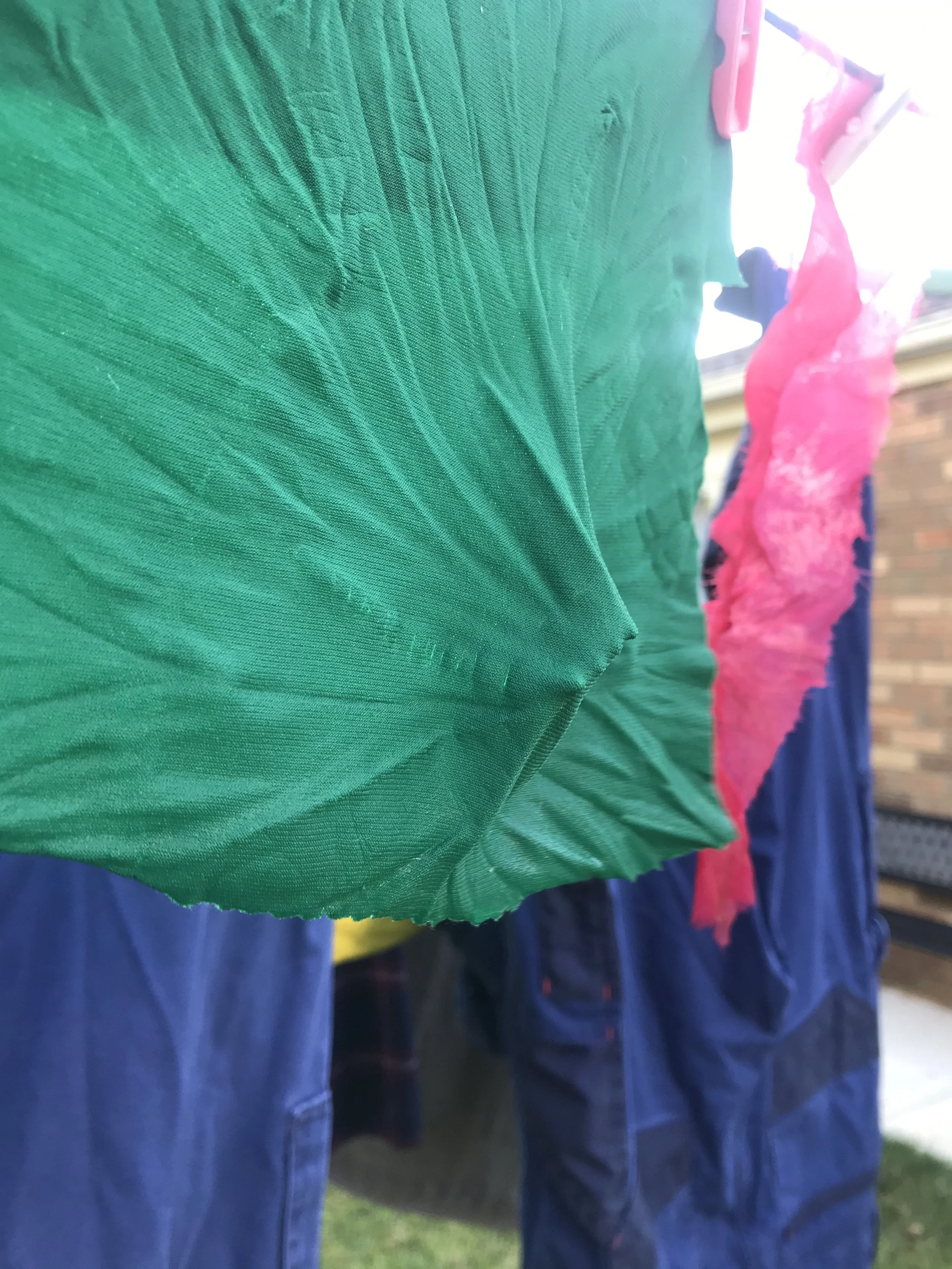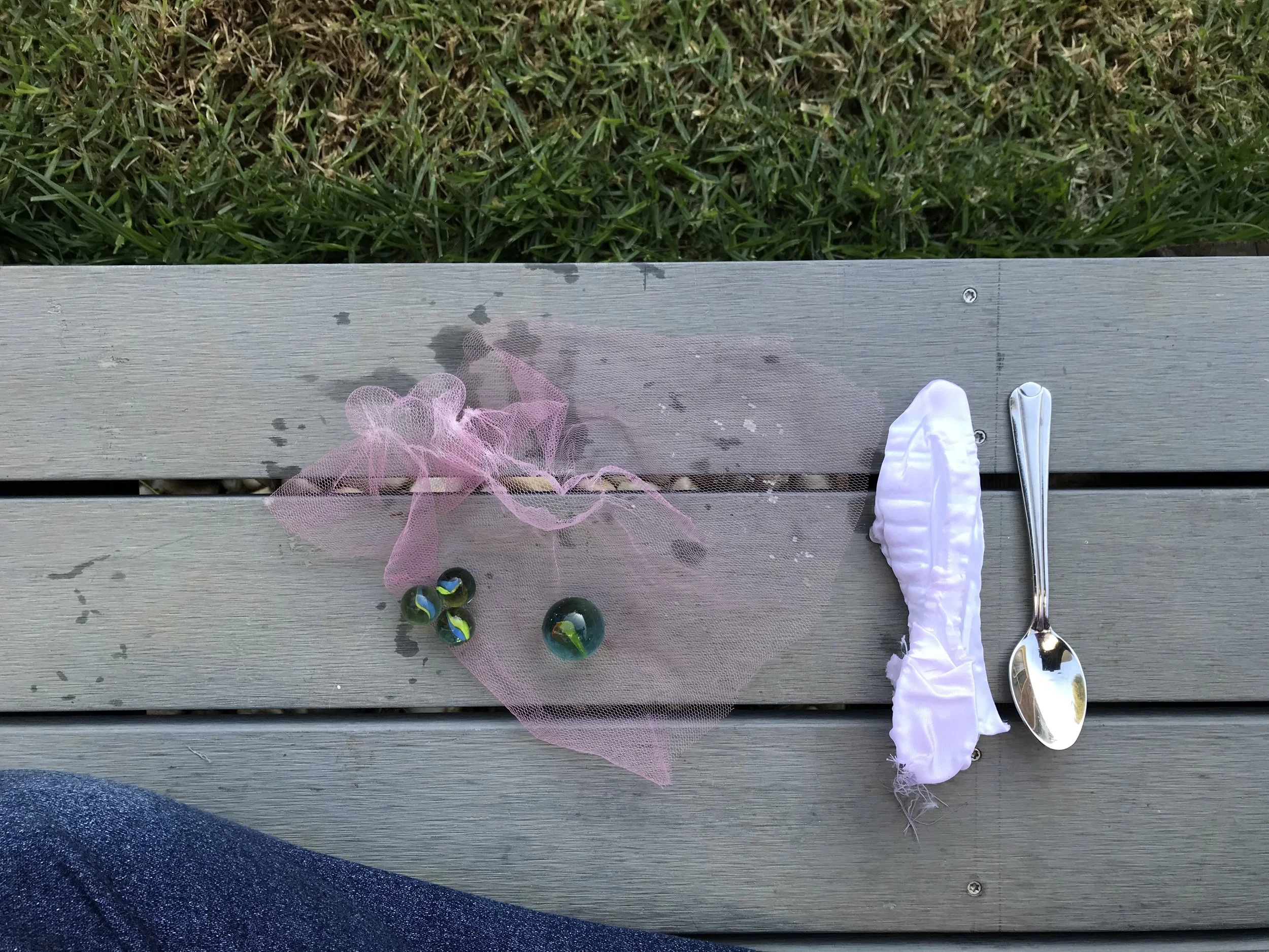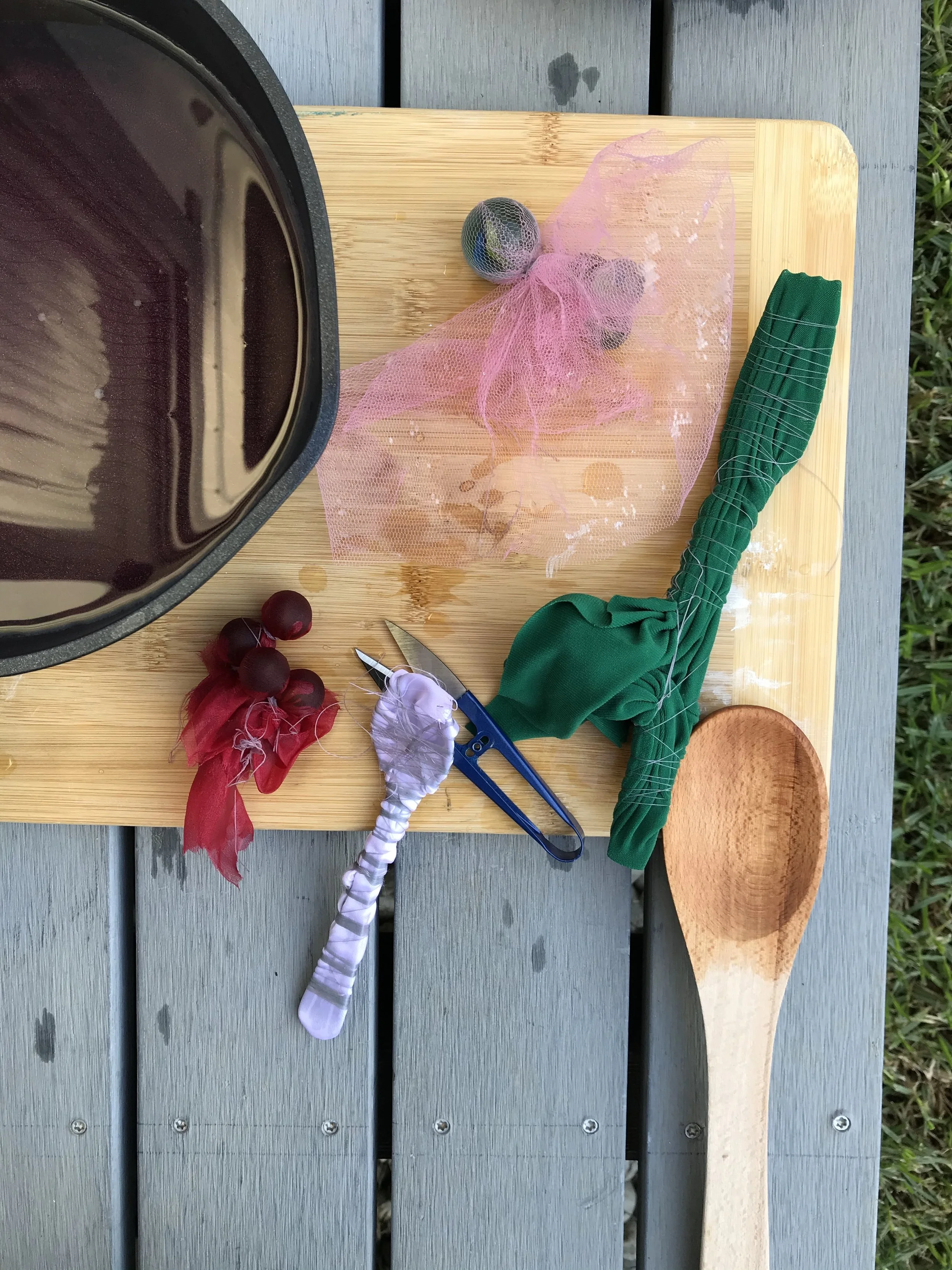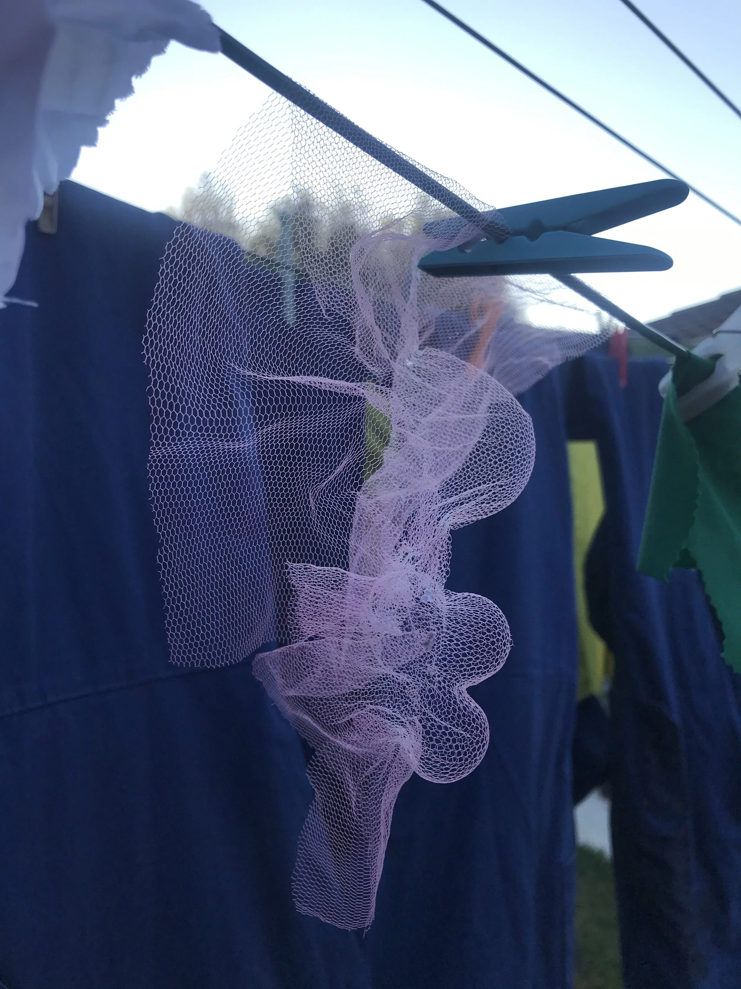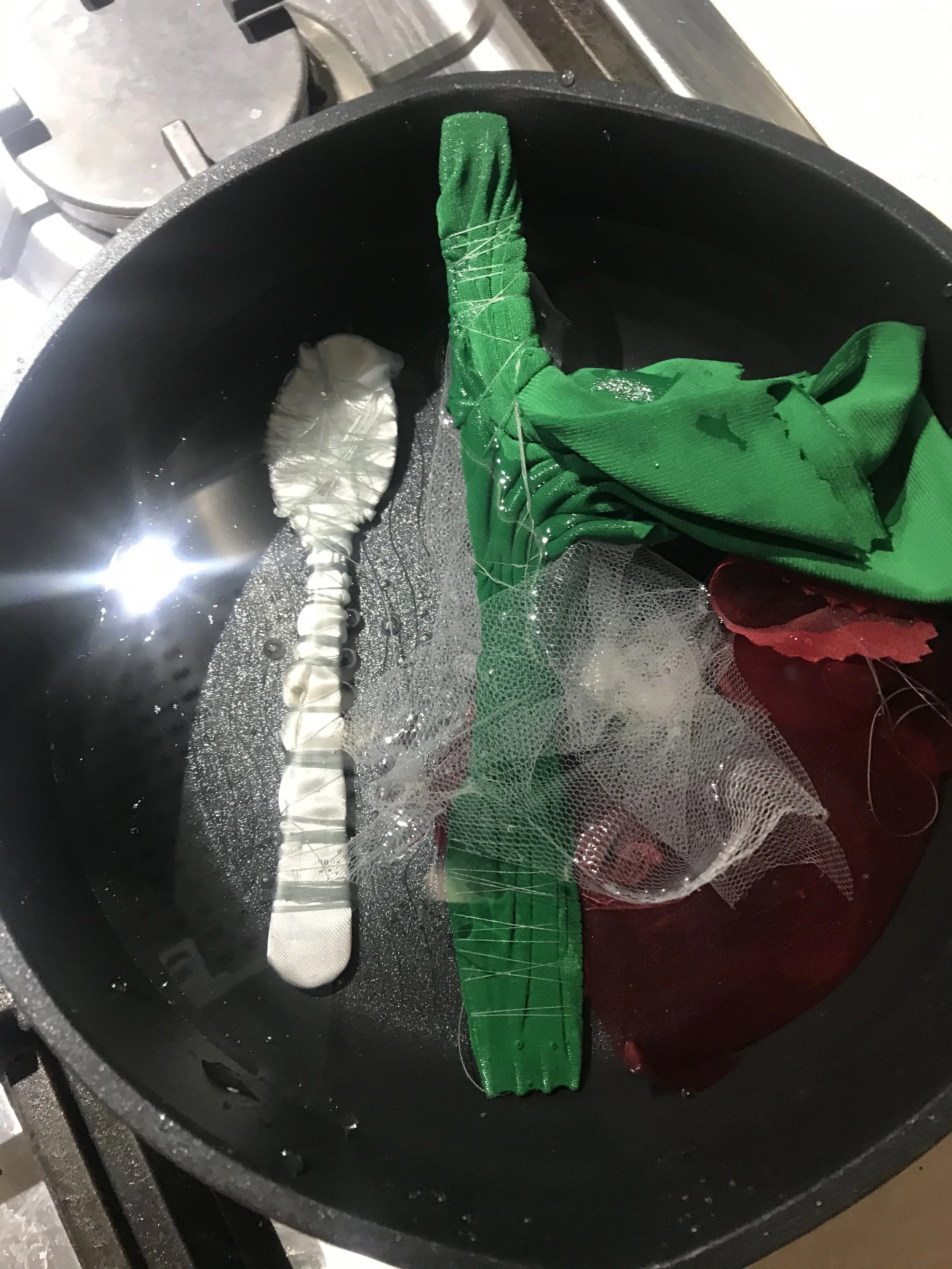 Nylon Tulle and polyester spoon sample drying. The spoon sample did retain the whole shape of the spoon as it was tied closely to the spoon multiple times.
