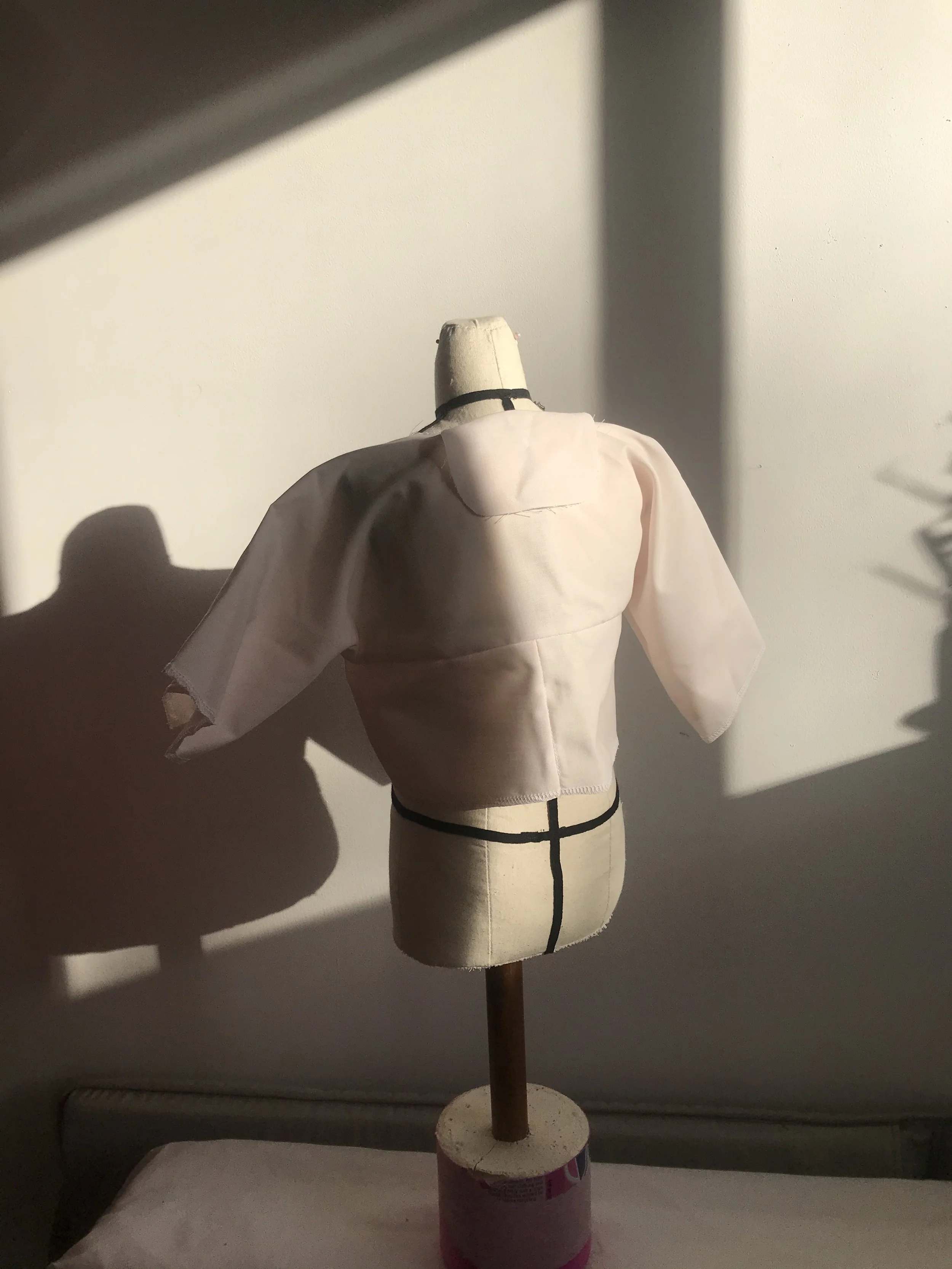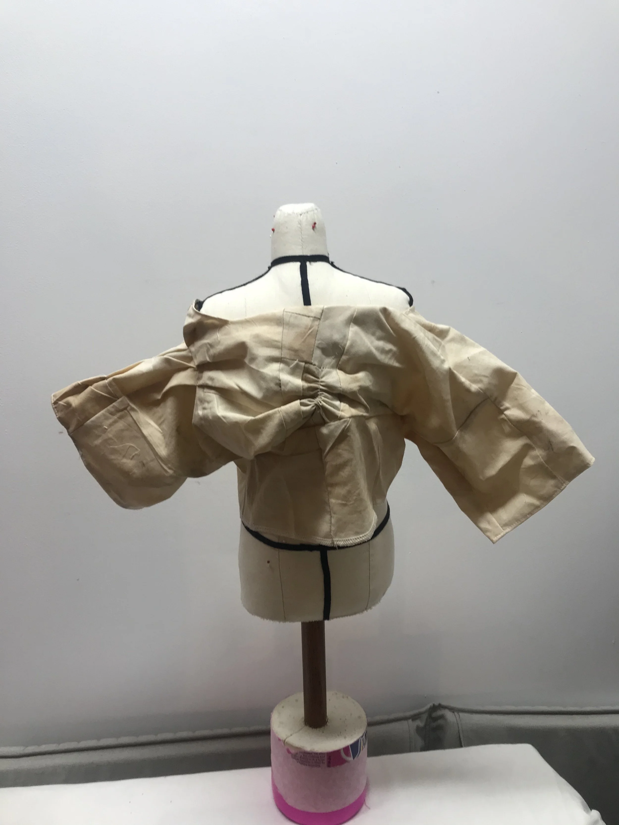 Zero waste T-shirt sample 2 back view, overall a lightweight and soft handle on sample, would benefit from having added the gathers and pleats after pattern had been cut from the flat patchwork