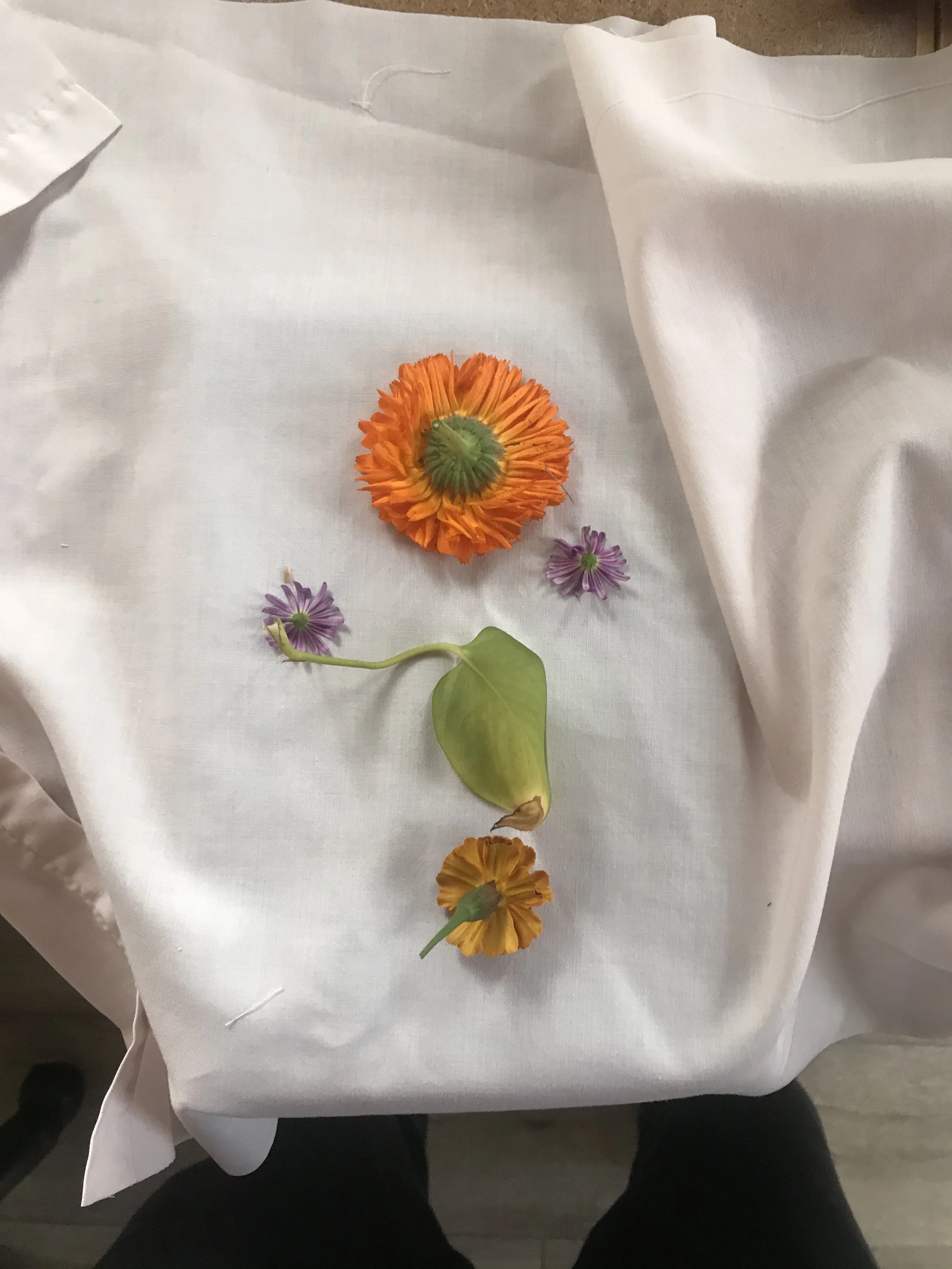 Fresh flowers faced down on cotton sample fabric before stamping