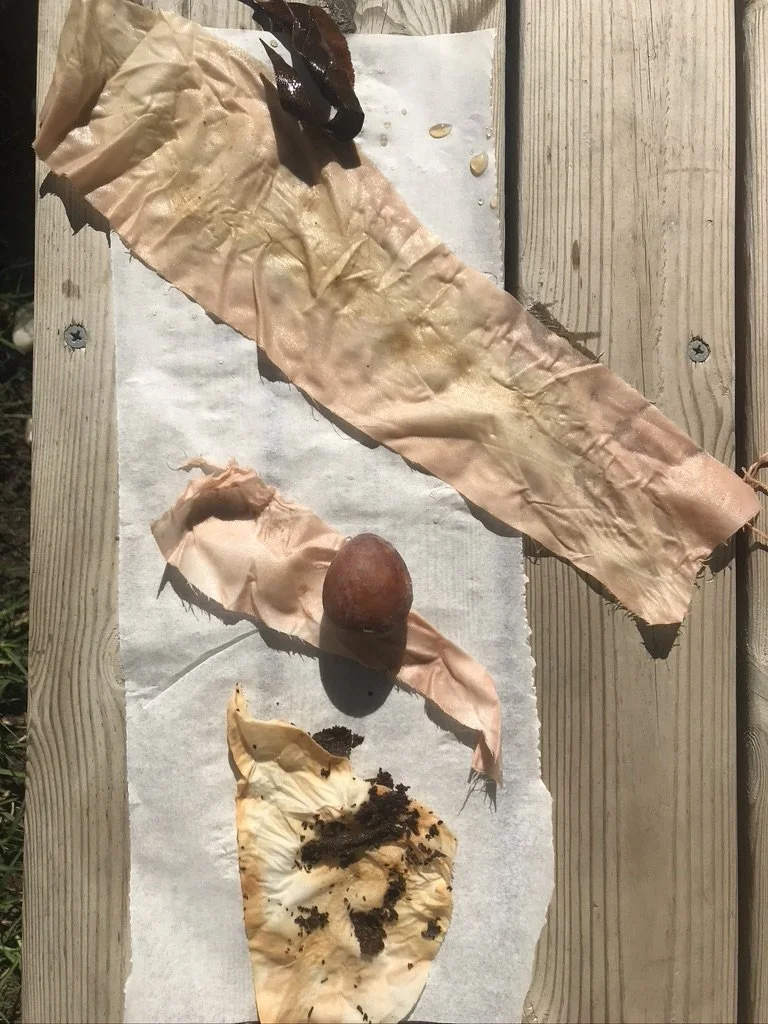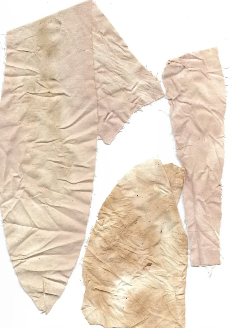 Top: Eucalyptus leaves wrapped in cotton sample, Middle: Avocado seed wrapped in cotton off-cut, Bottom: Tealeaves wrapped in cotton sample - Great way to use discarded food waste and eroding plant material