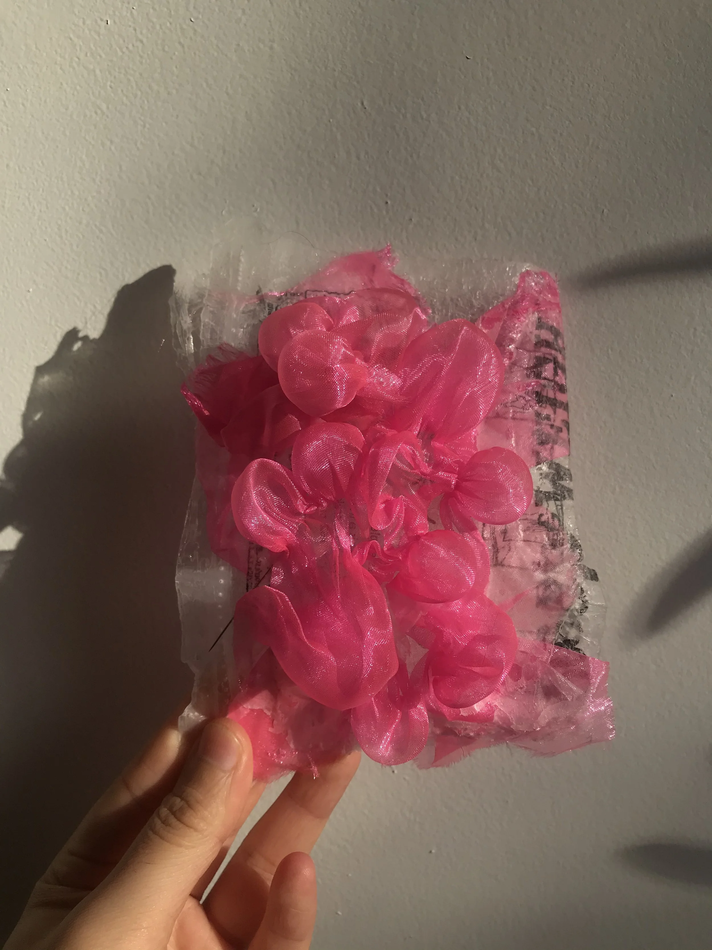 Pink Nylon Tulle wrapped with multiple marbles. To create the seal to the outer laminated shibori layer, The Recycled ‘scoop and weight’ Coles LDPE bag was folded in half and ironed on high settings without steam. This formed a high tensile strength, water resistant and flexible bottom layer that was laminated and pressed onto the laminated shibori fabric bottom. Sealing any and all exposed areas to create an 100% water proof fabric modification