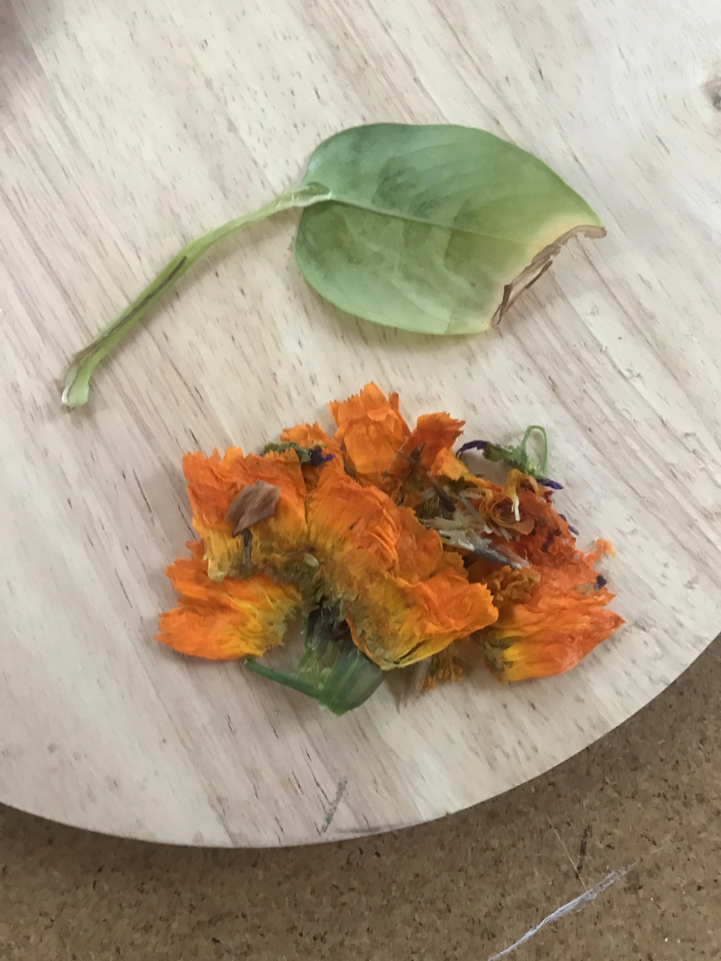 Eucalyptus leaf, Earl Grey tea and avocado pip samples after they've been dried
