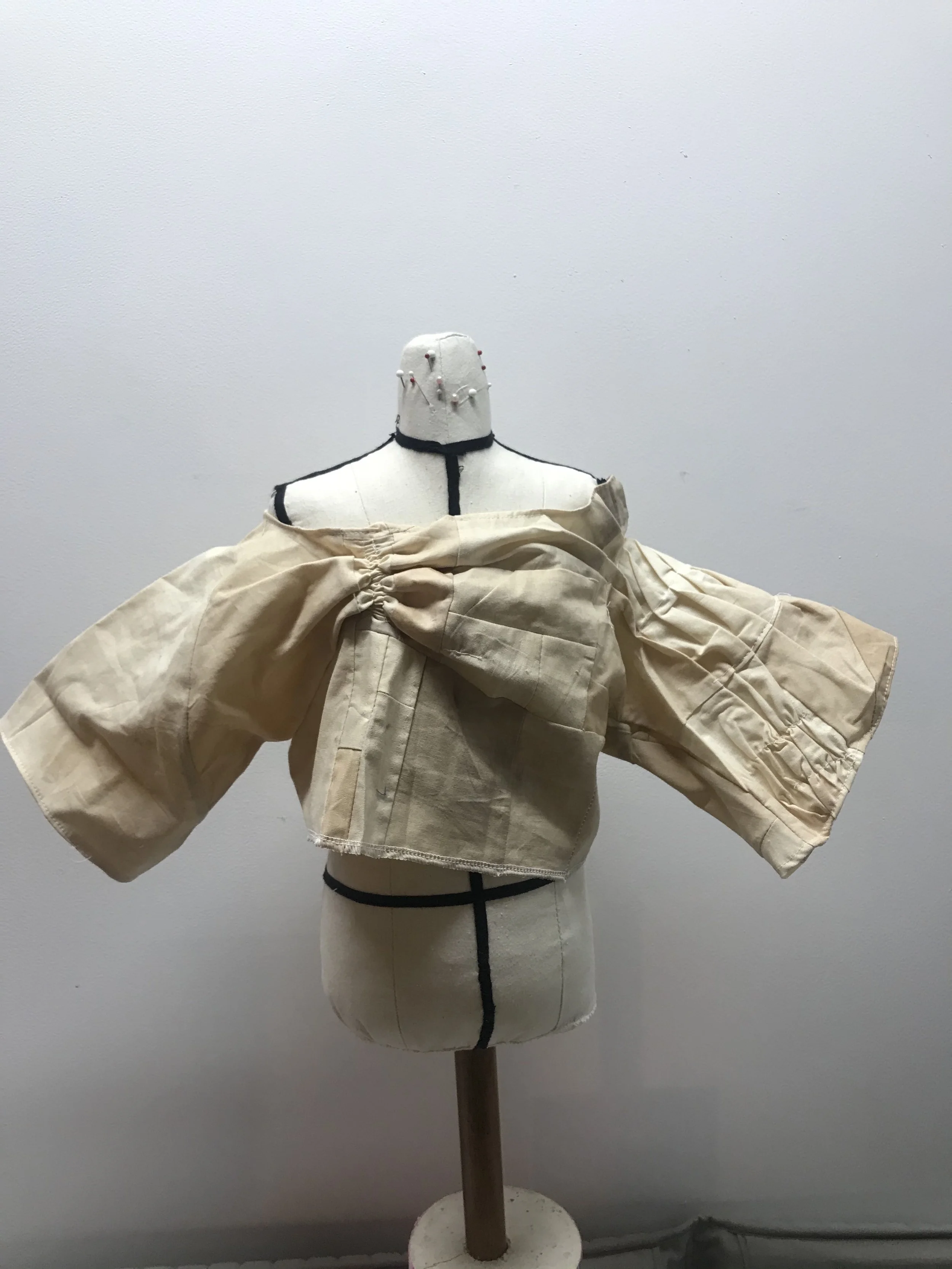 Zero Waste T-shirt Front made with naturally dyed cotton offcuts that have been overlocked together into patchwork and gathered in various places. Made for a difficult cut from the pattern, created an en even neckline with awkward gathers at the neck line and seam lines.