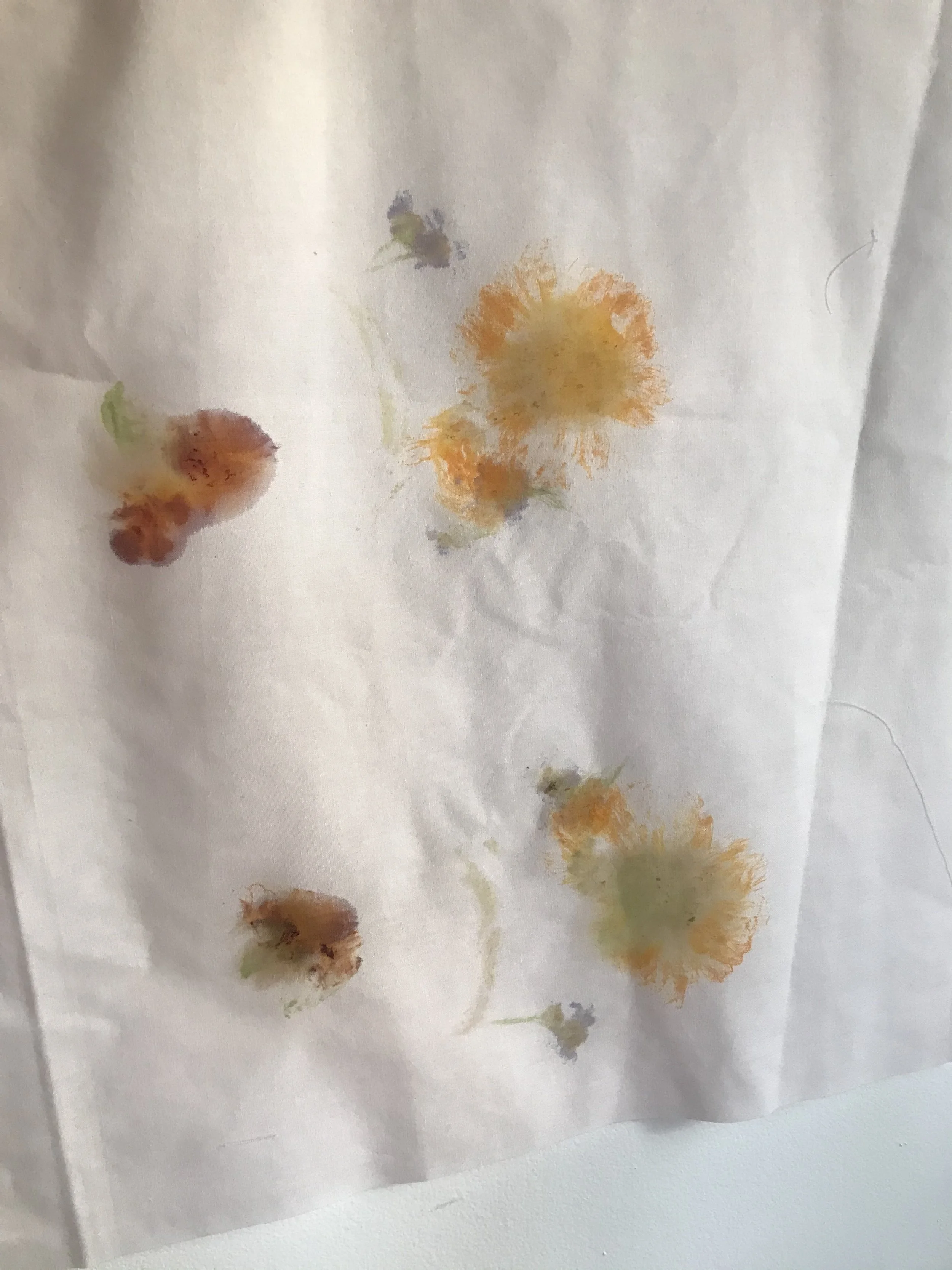 Flowers stamped onto cotton fabric ready to dry, result is very light yet indicative of flowers
