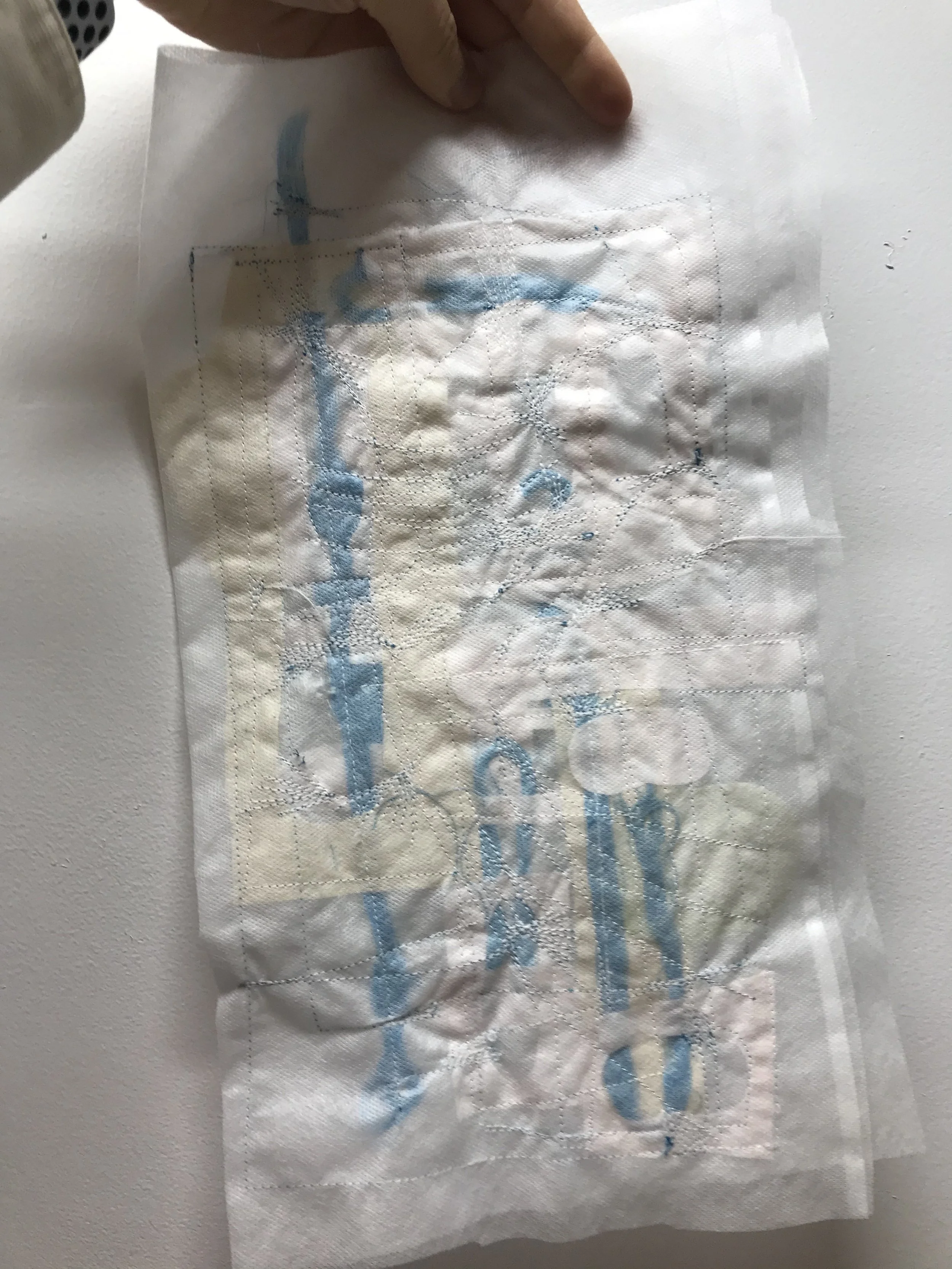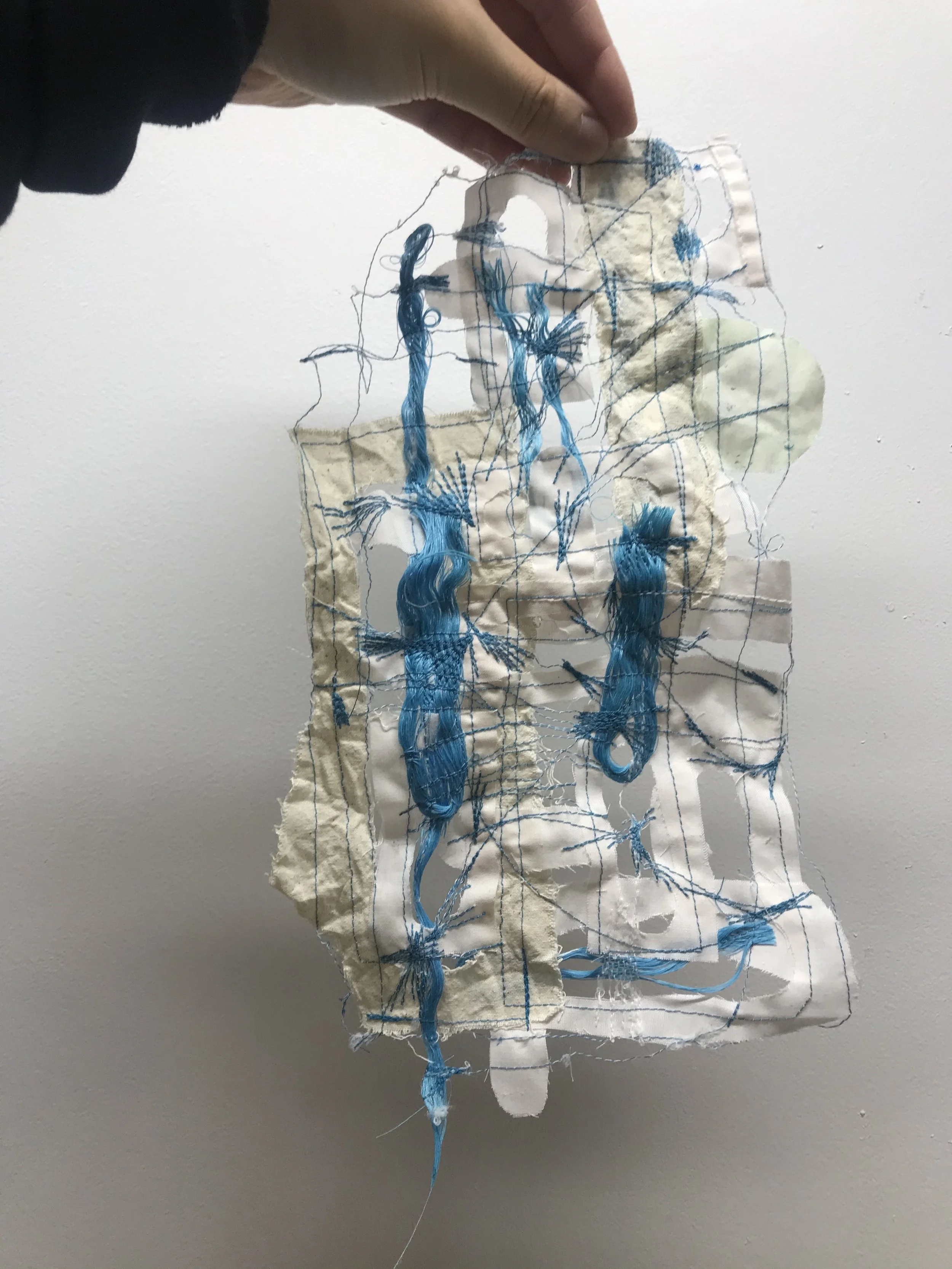 This sample has a stabilised foundation, as calico and cotton offcuts have been purposely placed in order to create an intentional collage of fabric overlays and thread overlays