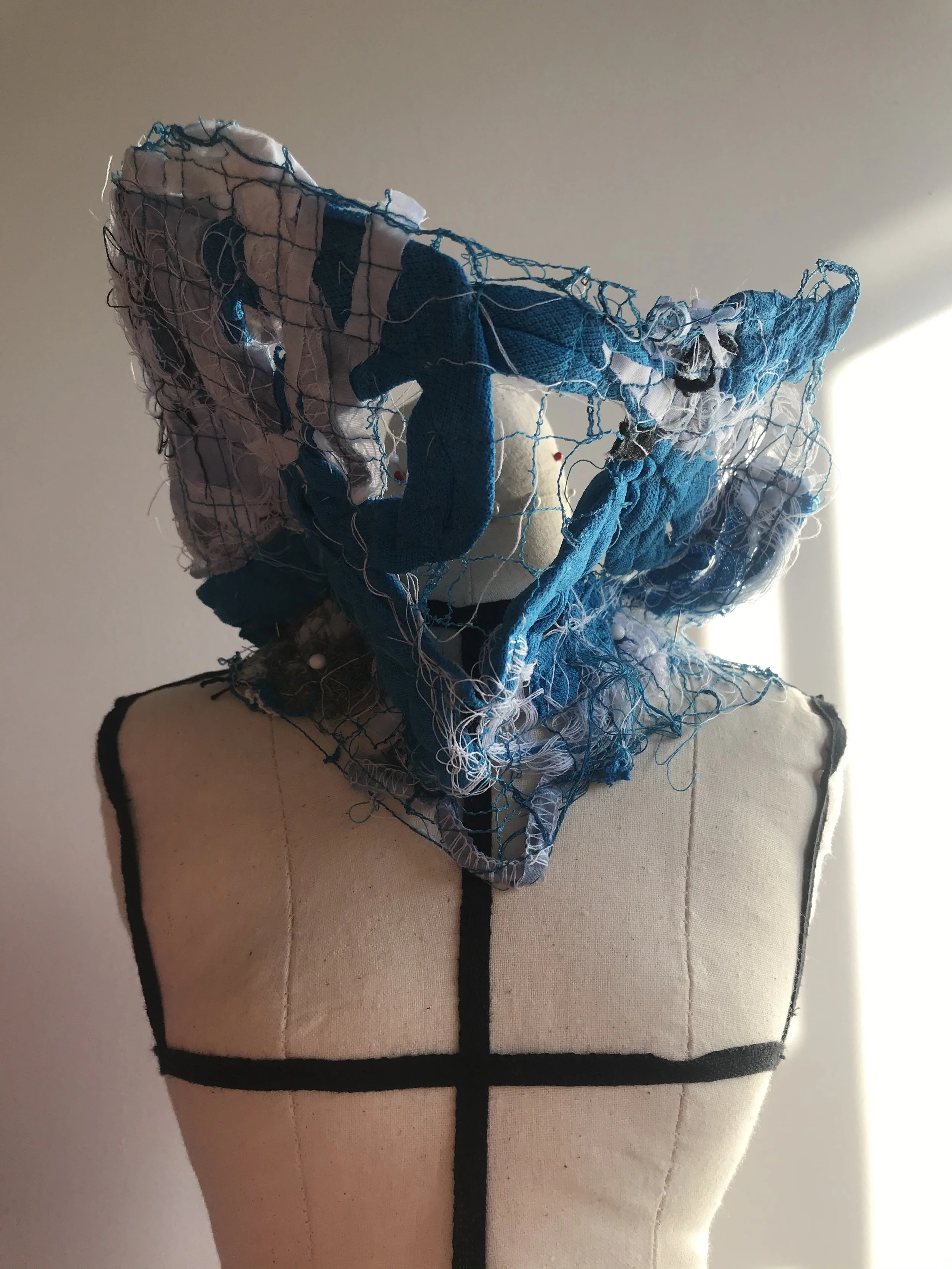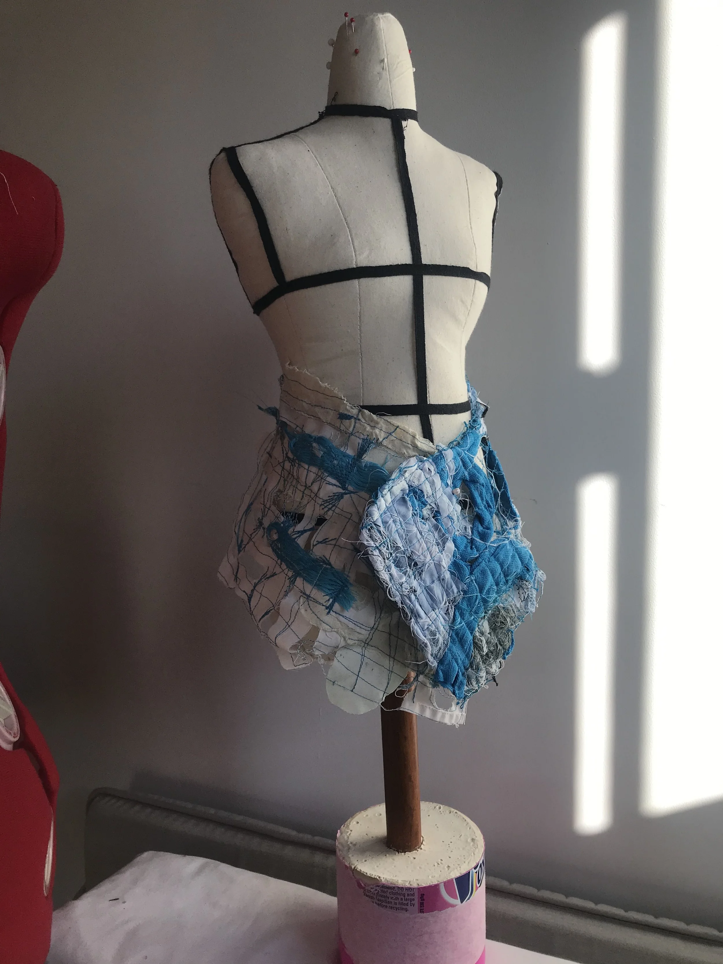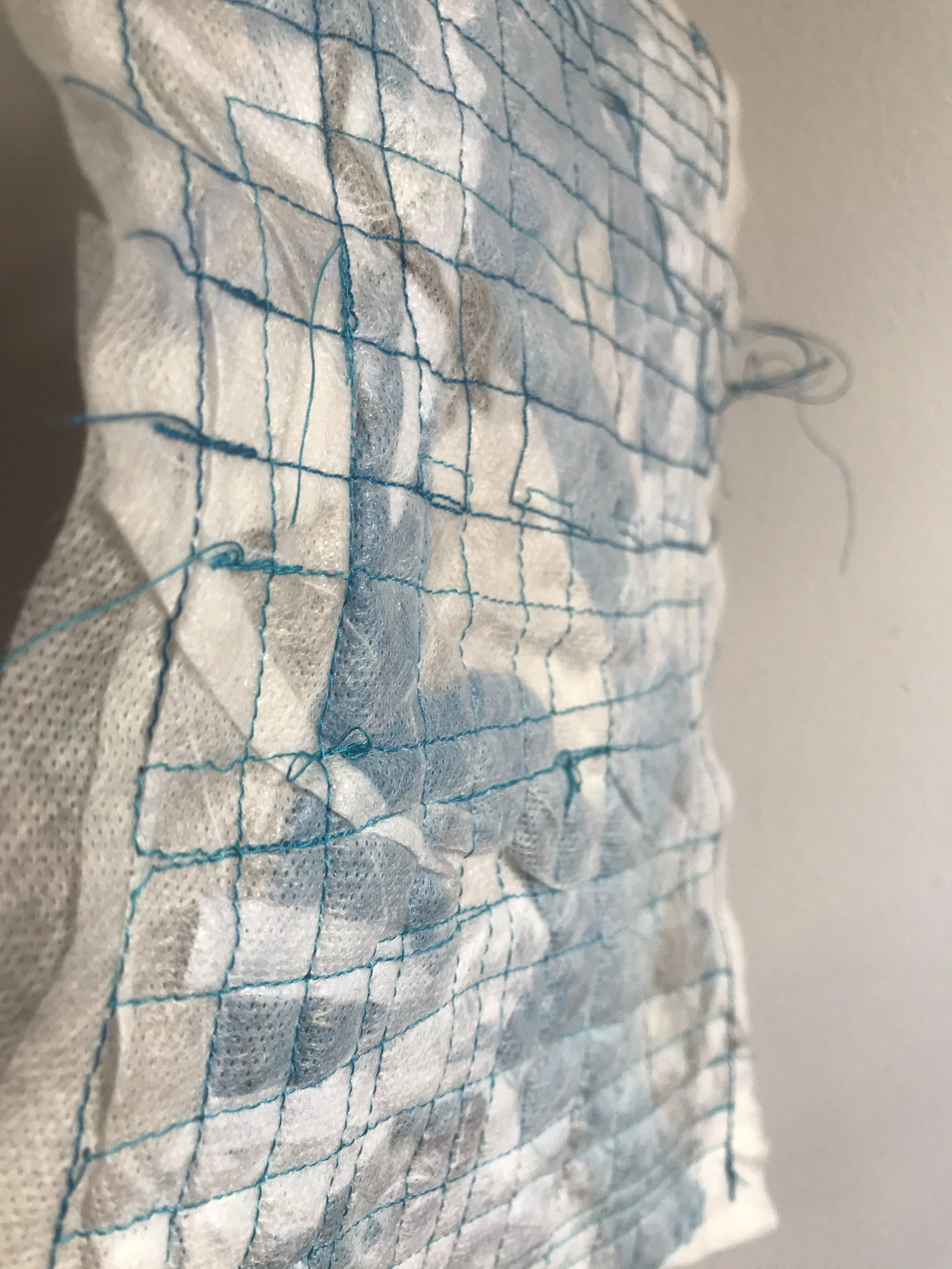 sample contains a variety of threads, both cotton and polyester offcuts from previous projects. The larger fabric portions in the lace are a mixture of blue cotton polo remnants and lino printed cotton offcuts that have been dyed with indigo dye.