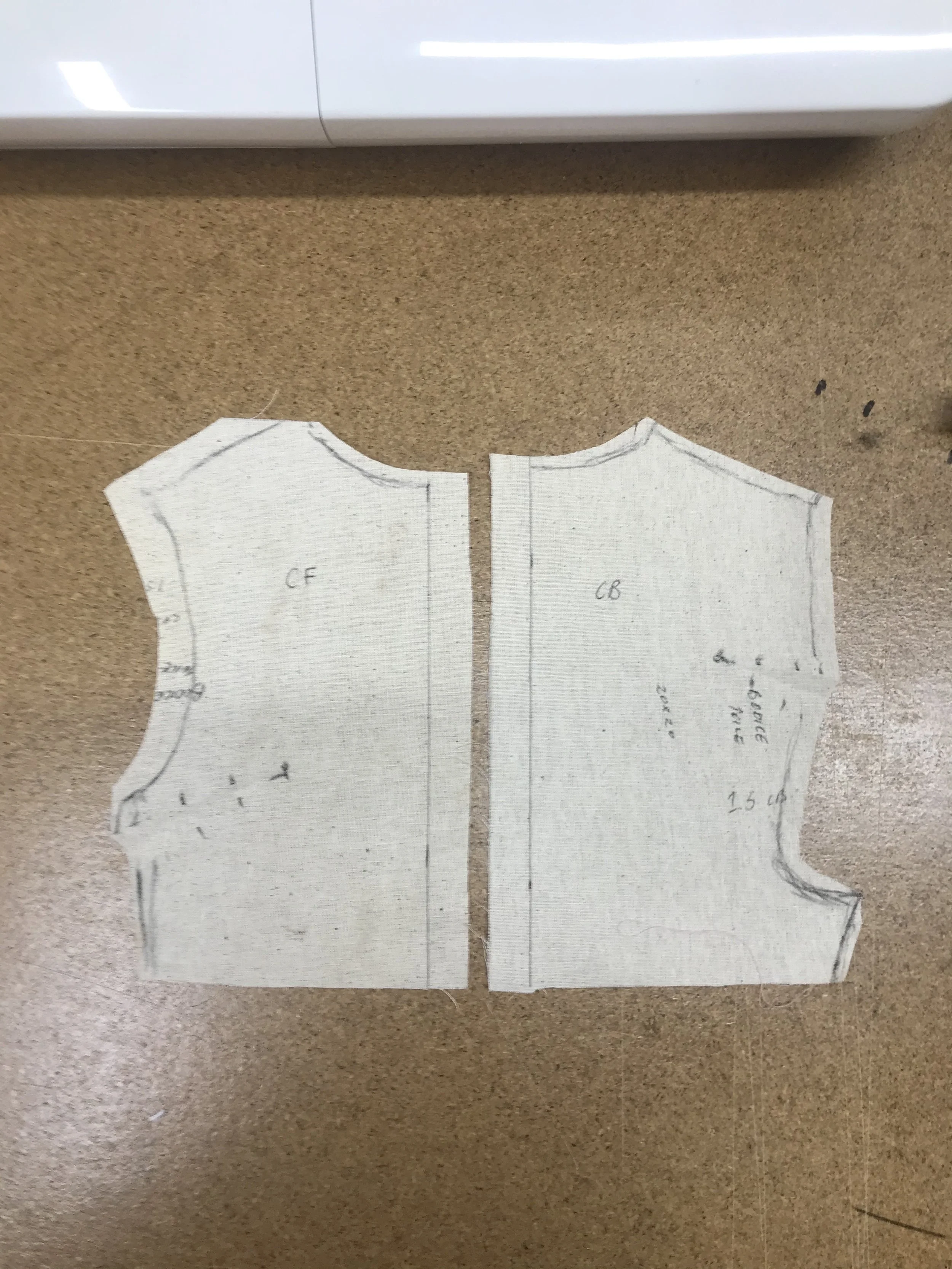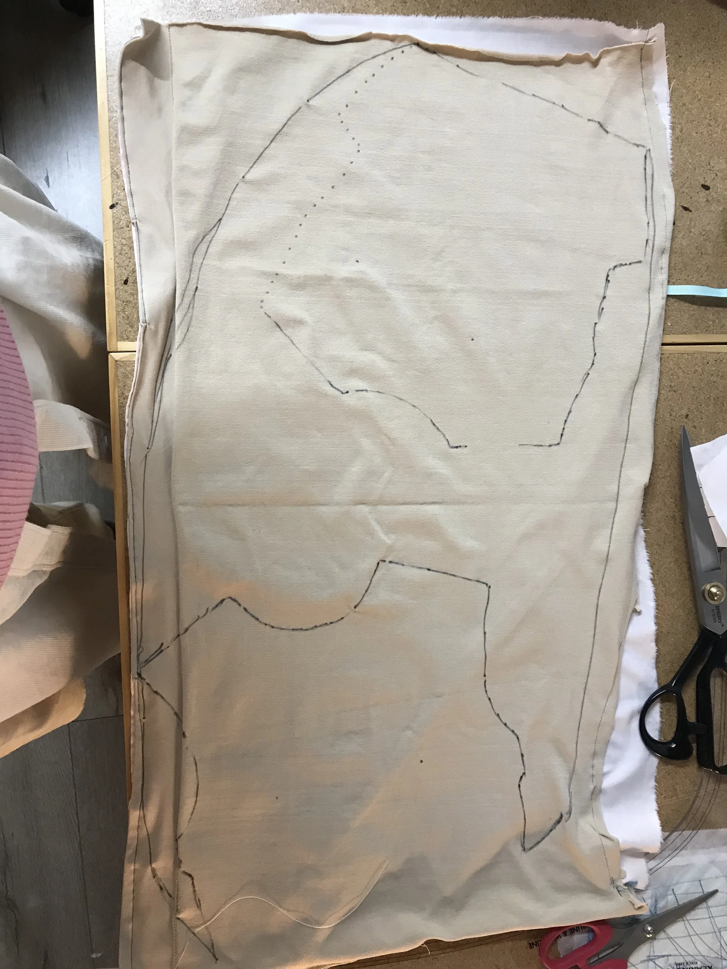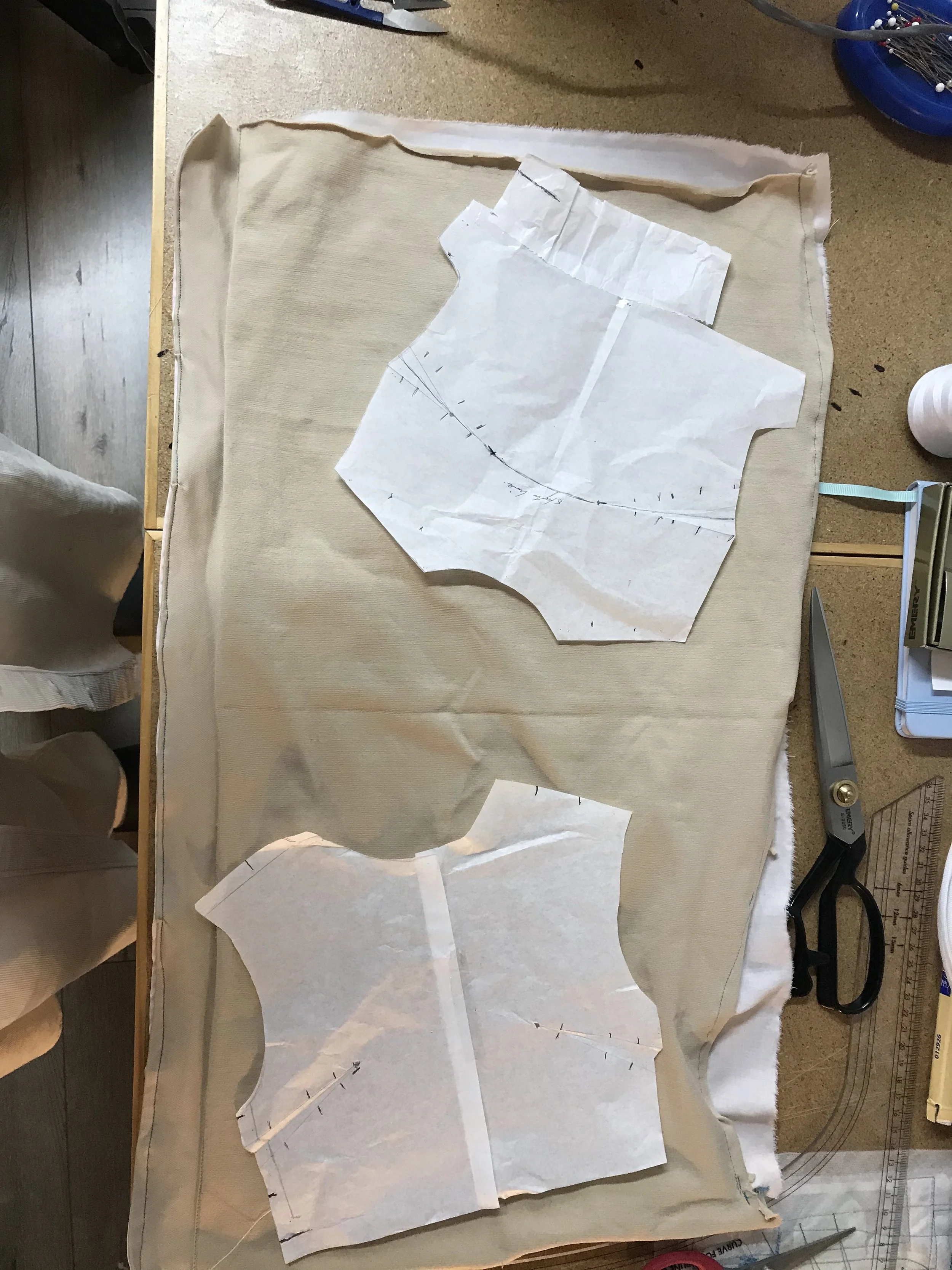 1/2 scale bodice pattern outline and cutting guide: Due to the minimal fabric I had left, I wasn't able to create the 50cm x 110cm and only had enough to create a 50 x 50 sample which meant that the side seams of the final toile fitted extremely close to the edge of each fabric swatch, this is what caused the irregular points at the hips what can be seen in the final toile images below